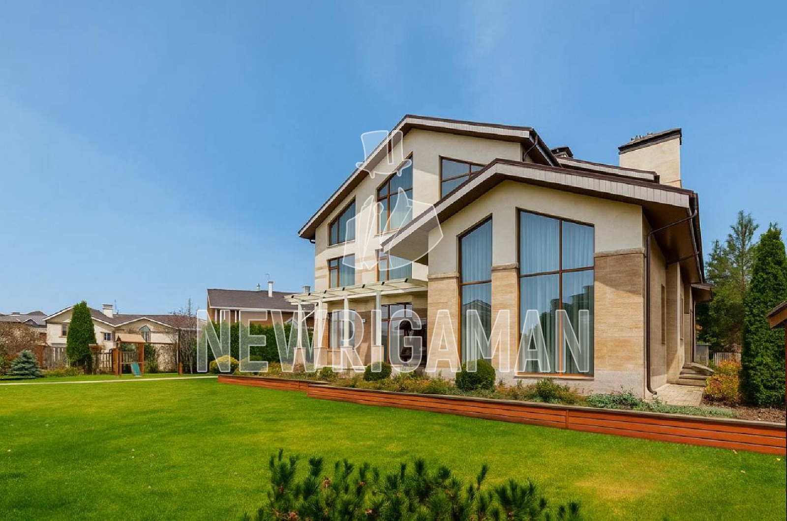 Инфраструктура внутренняя: общественная парковая территория площадью 4 гектара с живописным озером, элегантный ресторан на его берегу, теннисный корт, волейбольная площадка и пляж, лесная прогулочная зона, детский клуб, салон красоты, химчистка, минимаркет. Все коммуникации центральные. 2 КПП со строгой пропускной системой. Круглосуточное патрулирование и своя служба эксплуатации.