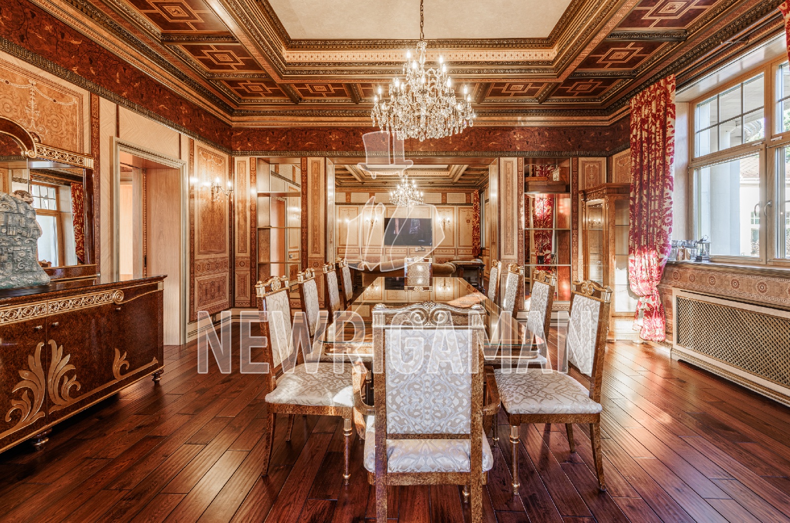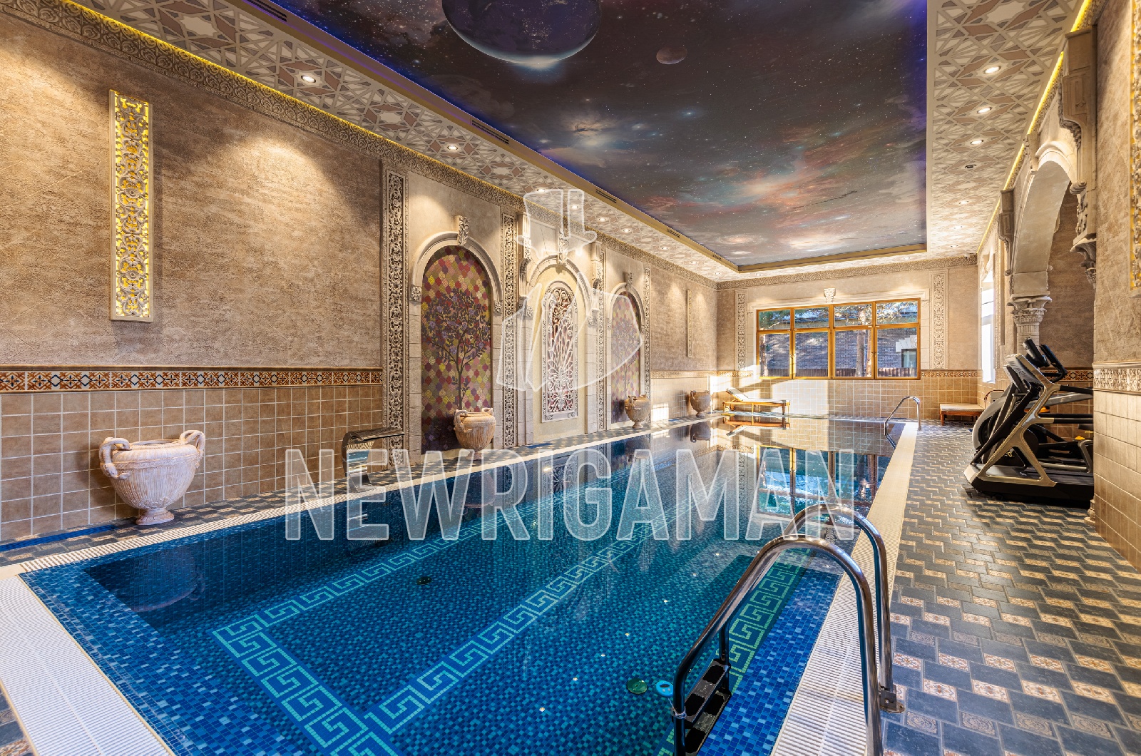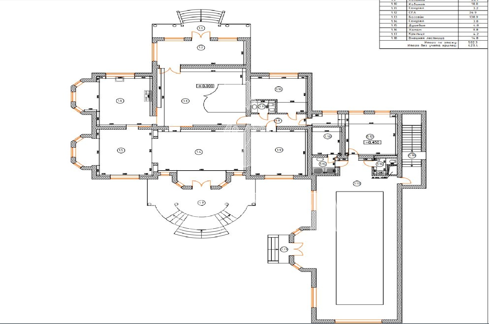 1 этаж - прихожая с гардеробной, парадный холл с резной лестницей, кухня, столовая, гостиная, гостевой с/у, два кабинета, СПА с с/у, хамам, бассейн с выходом на участок,