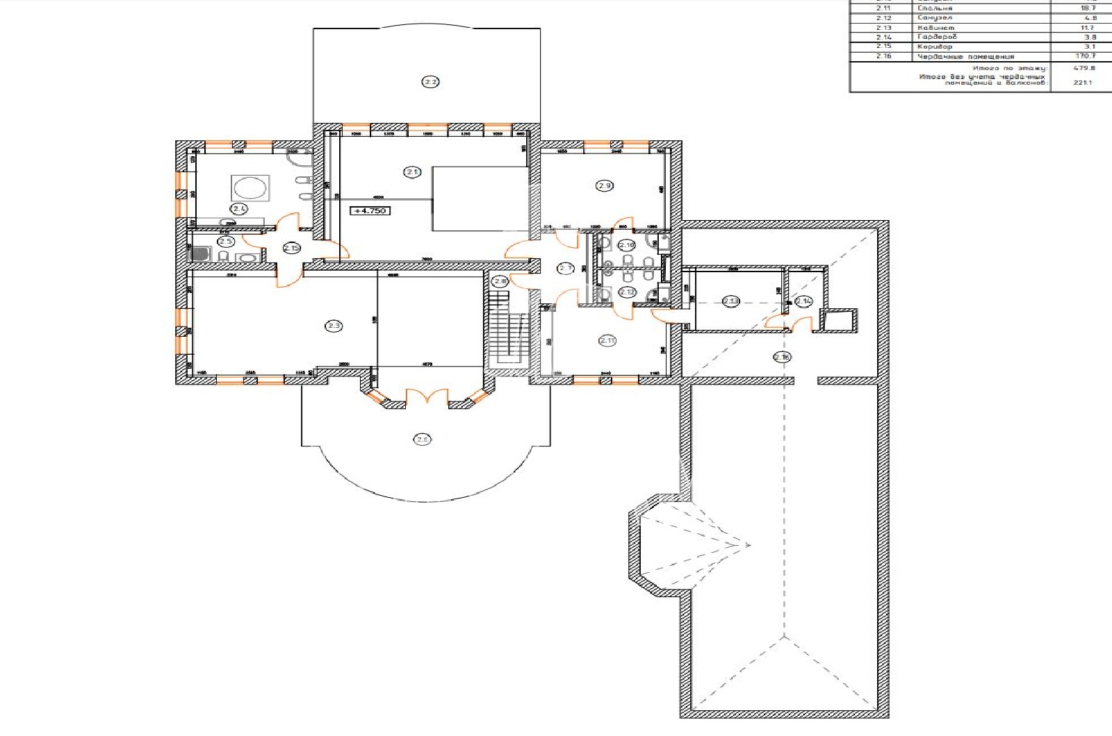 2 этаж - холл второго этажа с выходом на балкон, хозяйская спальня с гостиной, гардеробной, женской ванной комнатой и мужским с/у, спальни со своим с/у, спальня с кабинетом и с/у,
