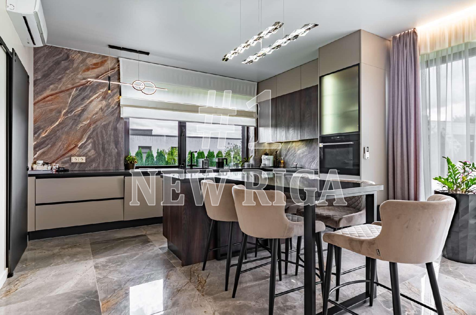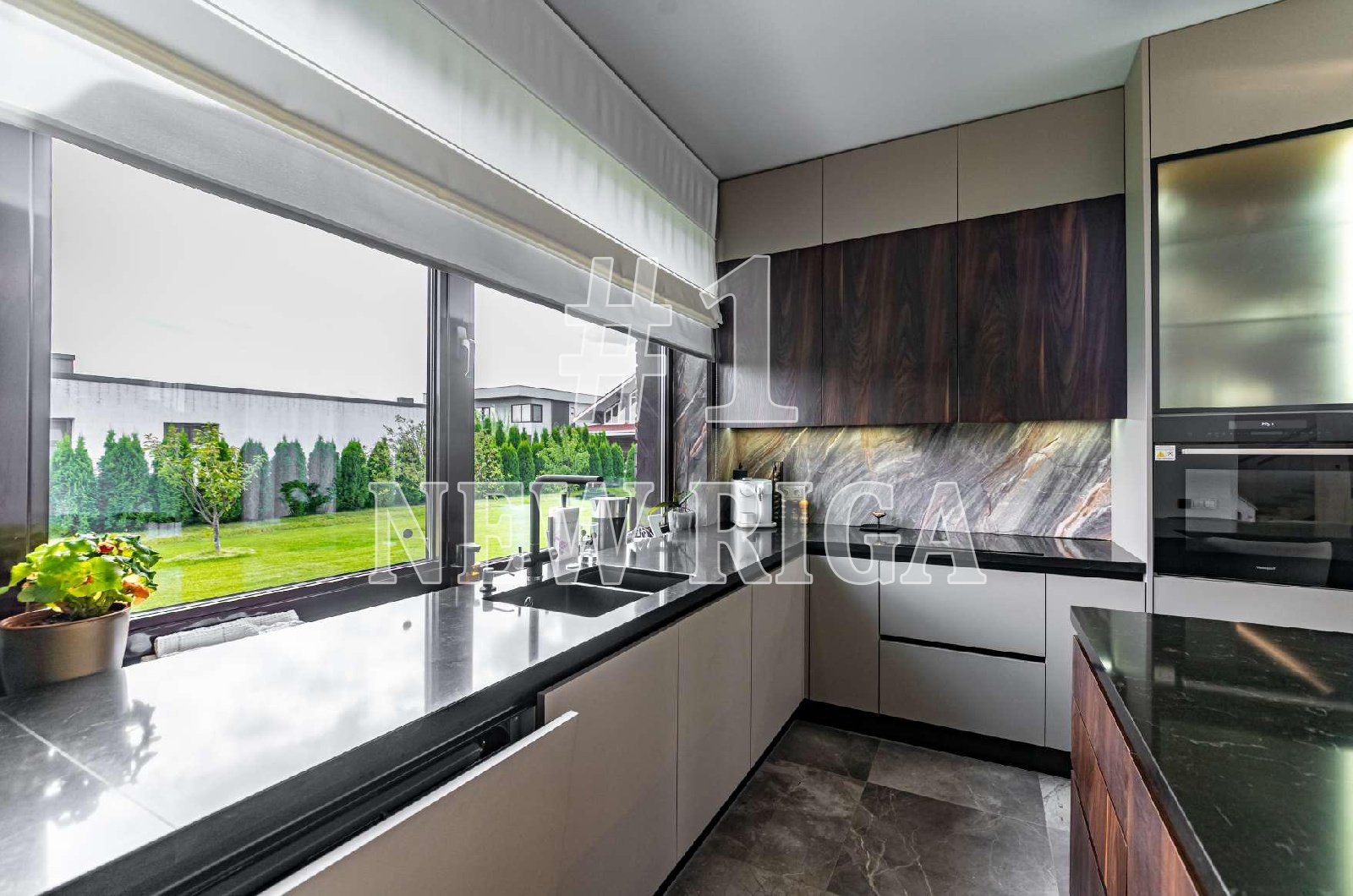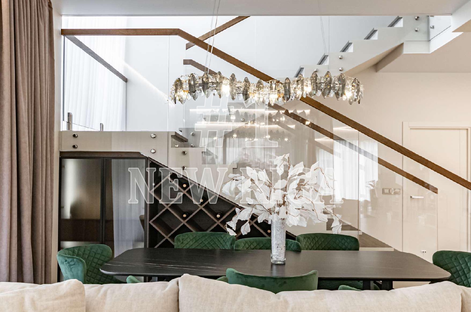 Продажа загородного дома площадью 407 кв. м, расположенный на Новорижском шоссе, в 23 км от МКАД, в престижном коттеджном поселке Новорижский. Коттедж в стиле Райта — это образец современной архитектуры, роскоши и удобства. Фасад выполнен в сдержанной гамме из декоративного кирпича и панелей, большие панорамные окна наполняют дом светом и подчеркивают его современный характер. Интерьеры дома продолжают идею современного стиля и комфорта. Кухня оформлена в минималистичном ключе с использованием премиальных материалов и оснащена техникой ведущих брендов. Удобный остров и барная зона создают пространство для семейных завтраков и встреч с друзьями. Гостиная просторная и светлая, с панорамным остеклением во всю стену, большим угловым диваном и современными дизайнерскими светильниками. Открытая лестница с деревянными ступенями и стеклянными перилами придает интерьеру легкость и элегантность. В отделке использованы натуральное дерево, крупноформатная плитка и нейтральные светлые оттенки, создающие атмосферу гармонии и уюта. Планировка продумана до мелочей: на первом этаже находятся гостиная, кухня-столовая, технические помещения и выход на террасу, на втором - приватная зона со спальнями, гардеробными и ванными комнатами. Дом полностью меблирован и укомплектован техникой премиального уровня. Есть гараж на 2 м/м с теплым переходом в дом, что делает проживание максимально комфортным в любое время года. Просторный участок площадью 15 соток грамотно благоустроен ландшафтным дизайнером: высажен и ухожен газон, декоративные насаждения и плодовые деревья, предусмотрена дренажная система и автополив с датчиком дождя. Для отдыха на свежем воздухе обустроена просторная терраса, костровая и барбекю-зоны, есть баскетбольная площадка для спорта и детская площадка с горкой и качелями.