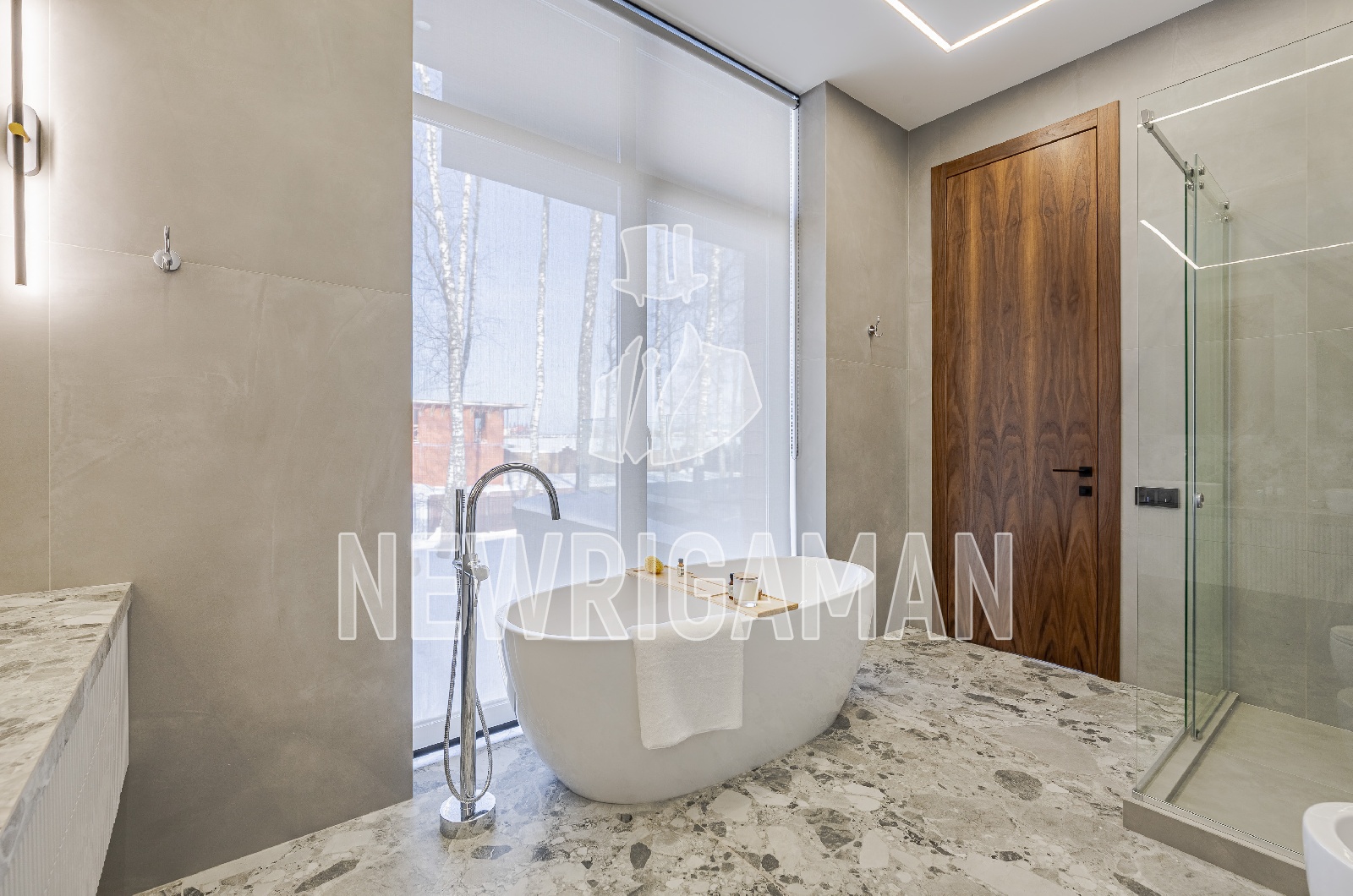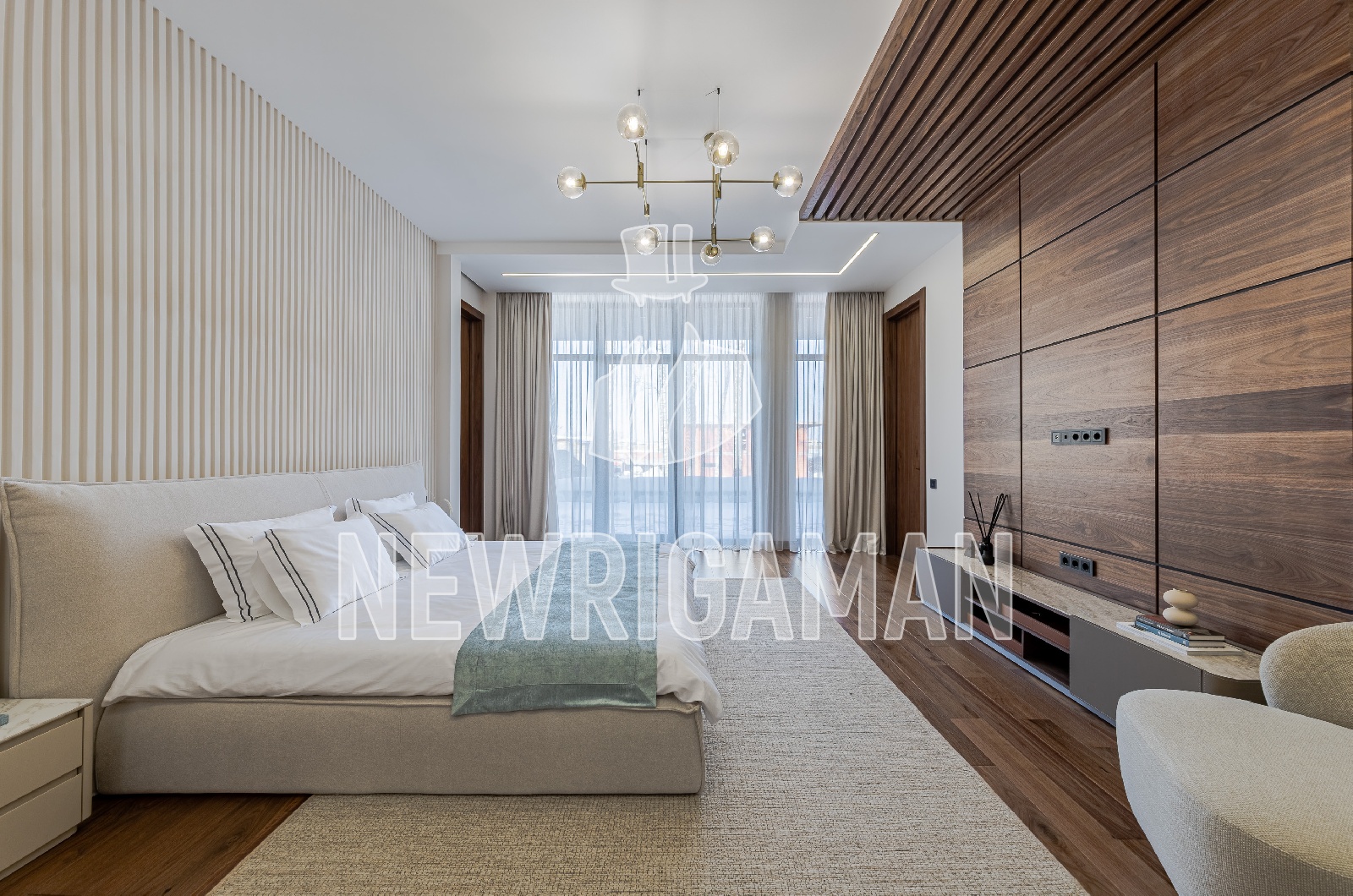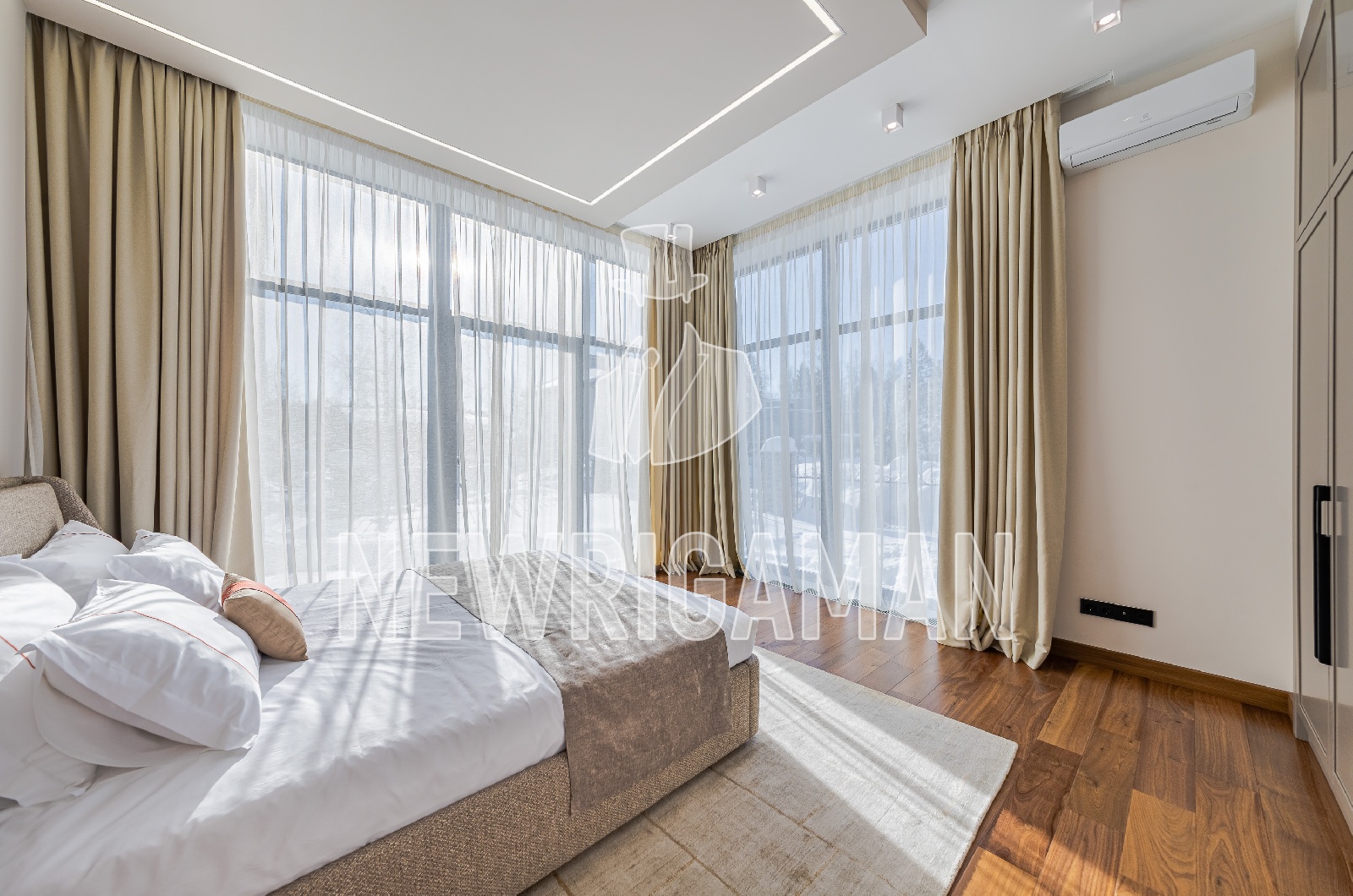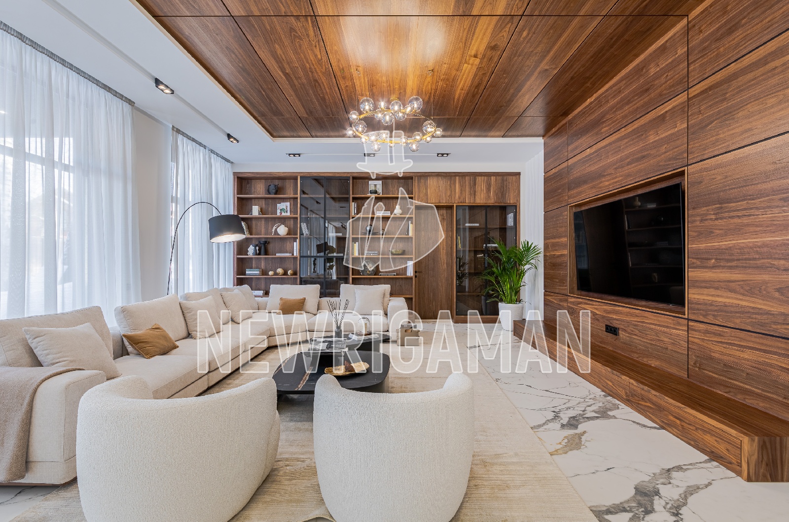 Продажа загородного дома общей площадью 437 кв.м. Новорижское шоссе, 19 км от МКАД. Коттеджный поселок Миллениум парк. Чёткие прямые линии и минималистичный дизайн фасада формируют выразительный и утончённый облик. В облицовке использованы контрастные материалы в сдержанных белых и тёмно-серых тонах с фактурой камня и дерева. Экстерьер подчеркивается декоративной подсветкой. Коттедж оснащён приточно-вытяжной вентиляцией, кондиционированием, подогревом полов и системой \"умный дом\". Интерьеры оформлены в современном стиле, где преобладают мягкие нейтральные оттенки. Натуральные древесные текстуры вносят акценты, добавляя пространству теплоту и сложность. Панорамные окна и многоуровневые потолки с тщательно продуманным освещением создают игру света и тени, создавая атмосферу уюта и гармонии. Дом полностью меблирован и укомплектован техникой от ведущих производителей. Площадь участка 8 соток.