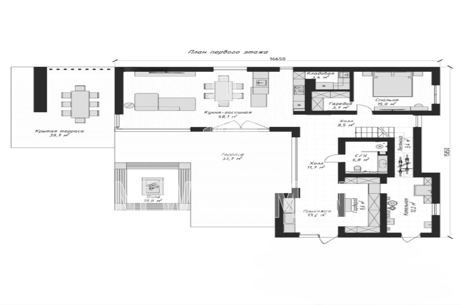1 этаж - прихожая с гардеробной, кухня-гостиная с выходом на террасу, черновая кухня (кладовая) в зоне кухни, котельная с отдельным входом, гостевая спальня с гардеробом, с/у с душевой,