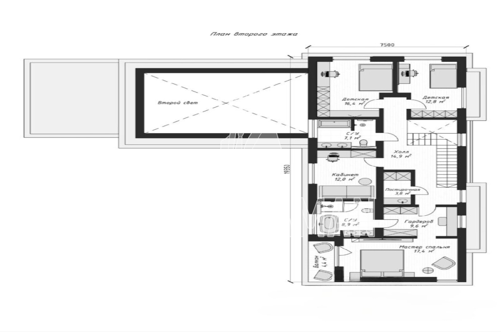 2 этаж - хозяйский блок с гардеробом, с/у и балконом, 2 детские, постирочная, детский с/у, кабинет.
