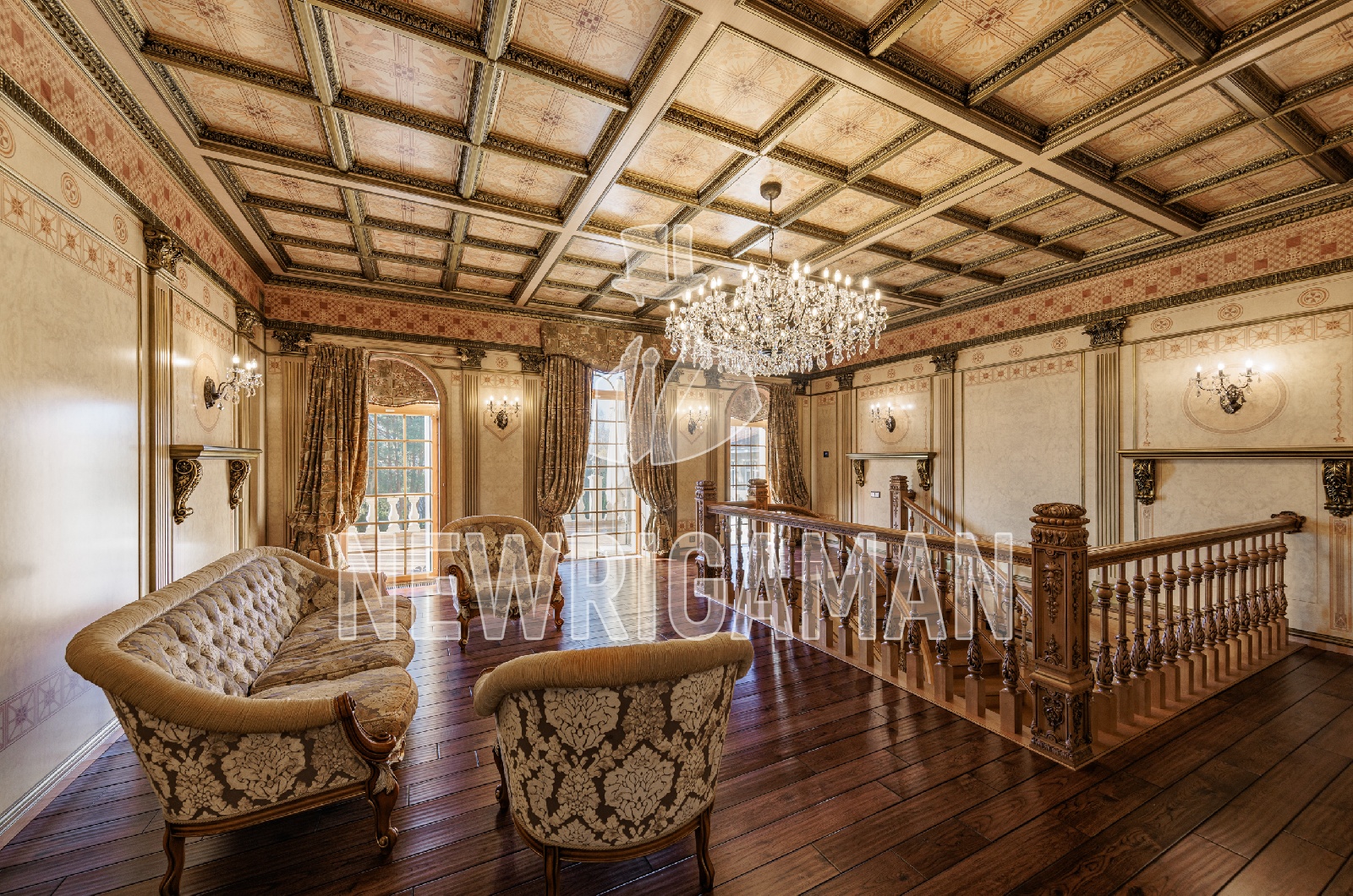 2 этаж - холл второго этажа с выходом на балкон, хозяйская спальня с гостиной, гардеробной, женской ванной комнатой и мужским с/у, спальни со своим с/у, спальня с кабинетом и с/у,