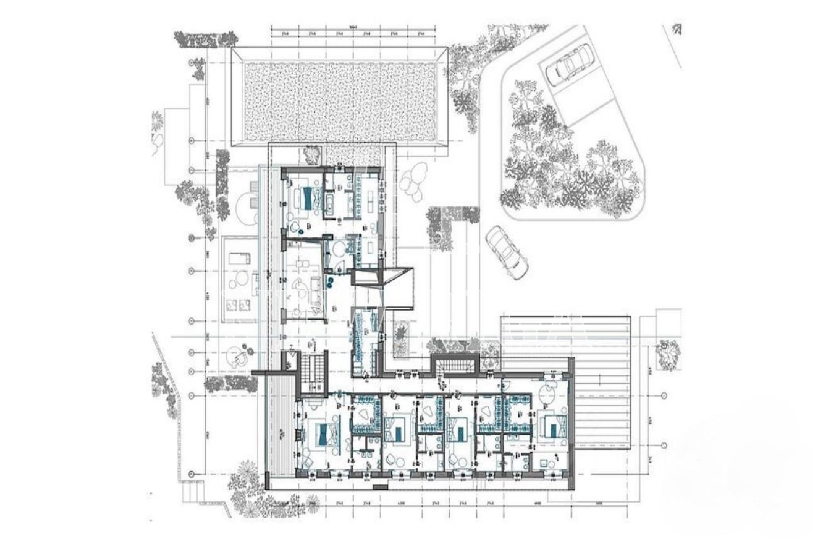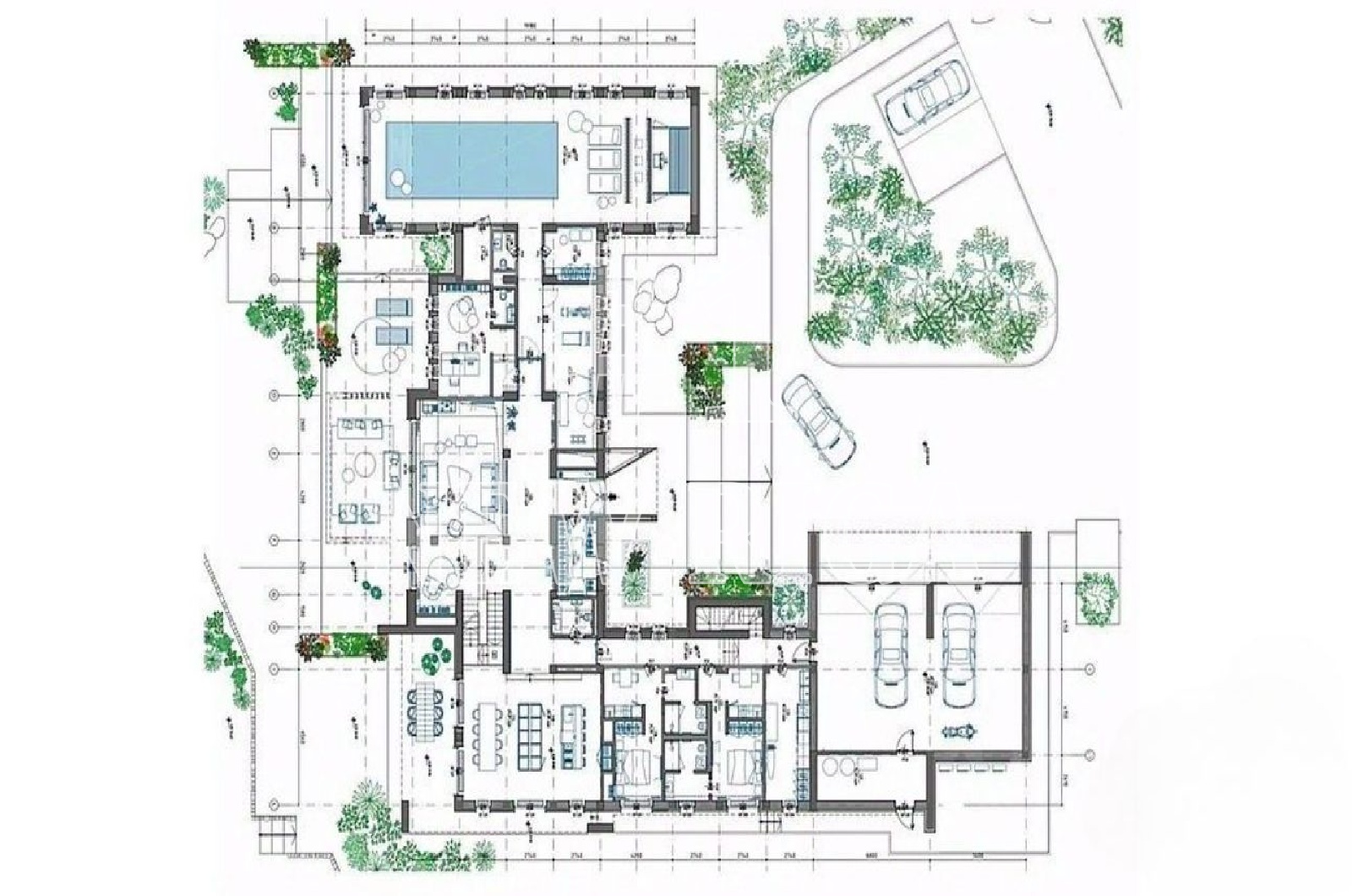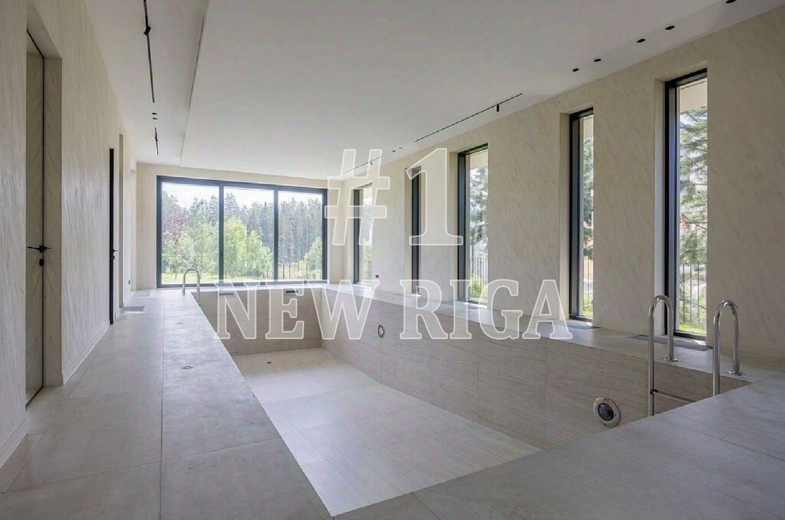 1 этаж - гостиная-столовая-кухня, вторая гостиная, котельная, санузел, гардеробная, кабинет с санузлом и выходом на террасу, СПА-зона с бассейном, сауной, купелью и выходом на террасу, тренажерный зал, санузел, 2 квартиры для персонала, постирочная, гараж на 4 м/м,