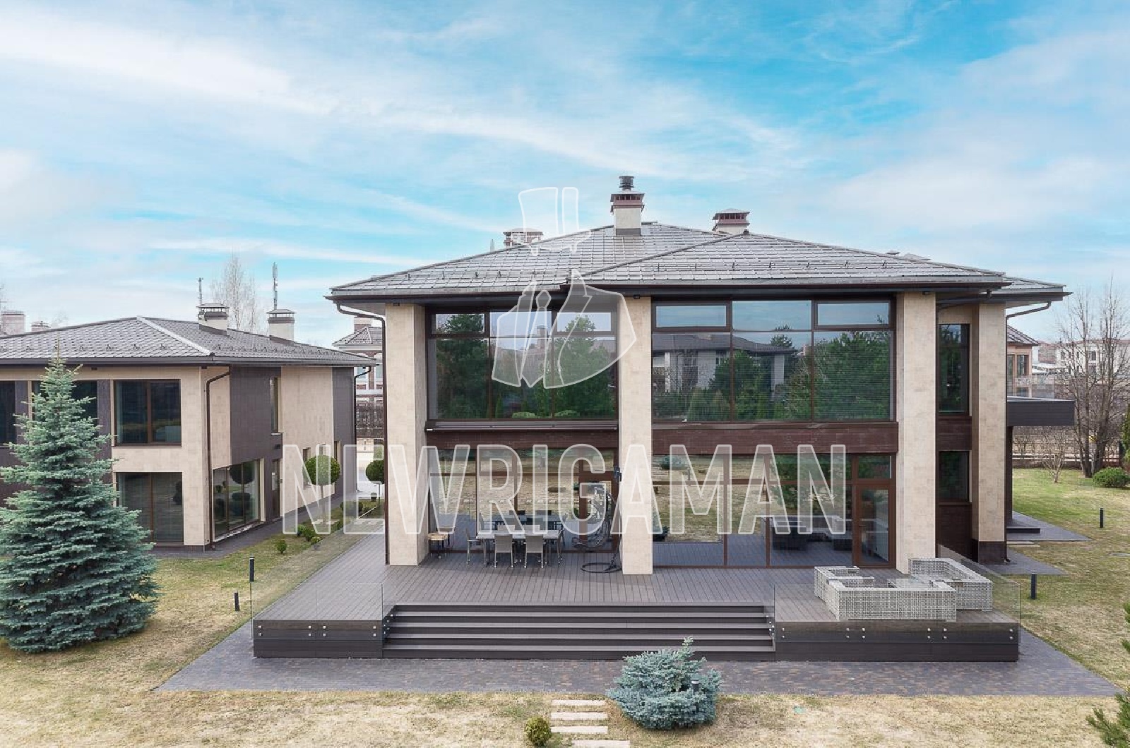 Аренда загородного дома общей площадью 515 кв.м. Коттеджный поселок Миллениум Парк. Новорижское шоссе, 19 км от МКАД. Коттедж построен в 2 этажа. Под ключ с мебелью. Панорамное остекление, большое количество света. Свой выход к каналу. На участке 29 соток высажены разнообразные кустовые и деревья, оформлена живая изгородь, все дорожки вымощены. На участке построен гостевой дом площадью 222 кв.м со своим гаражом.