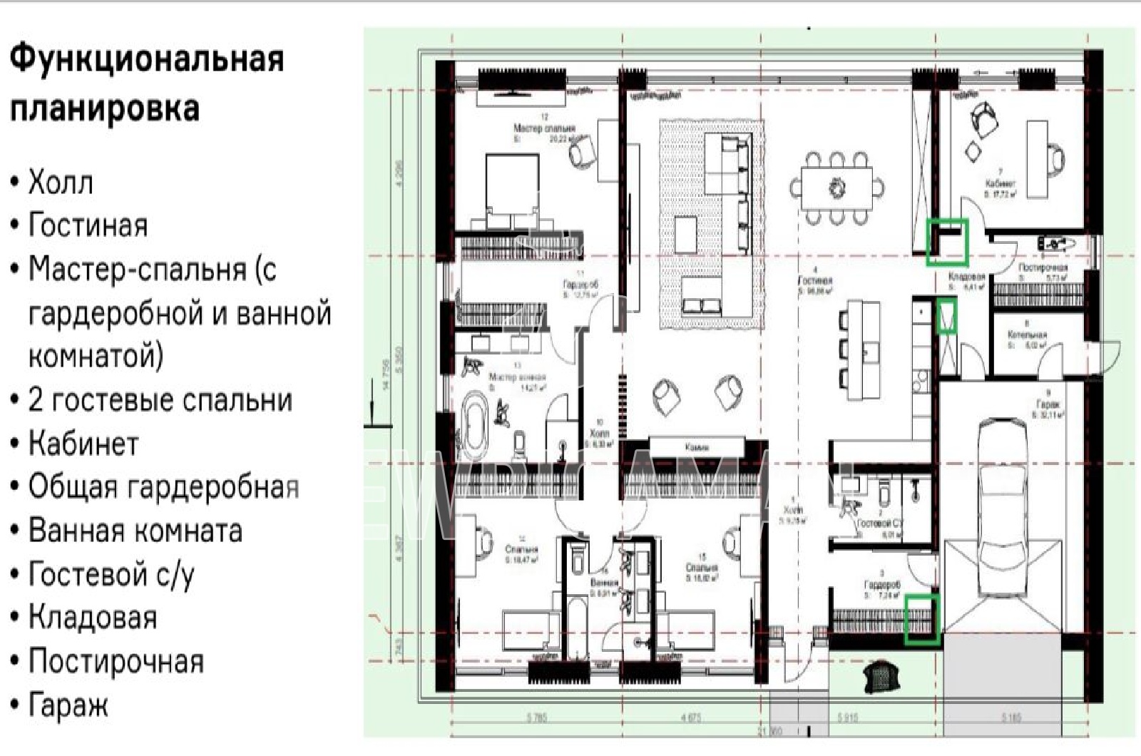 Холл, гостевой с/у, гардеробная, гостиная, кабинет/гостевая спальня, мастер-спальня с ванной и гардеробной, 2 спальни, ванная комната, кладовая, постирочная, гараж.