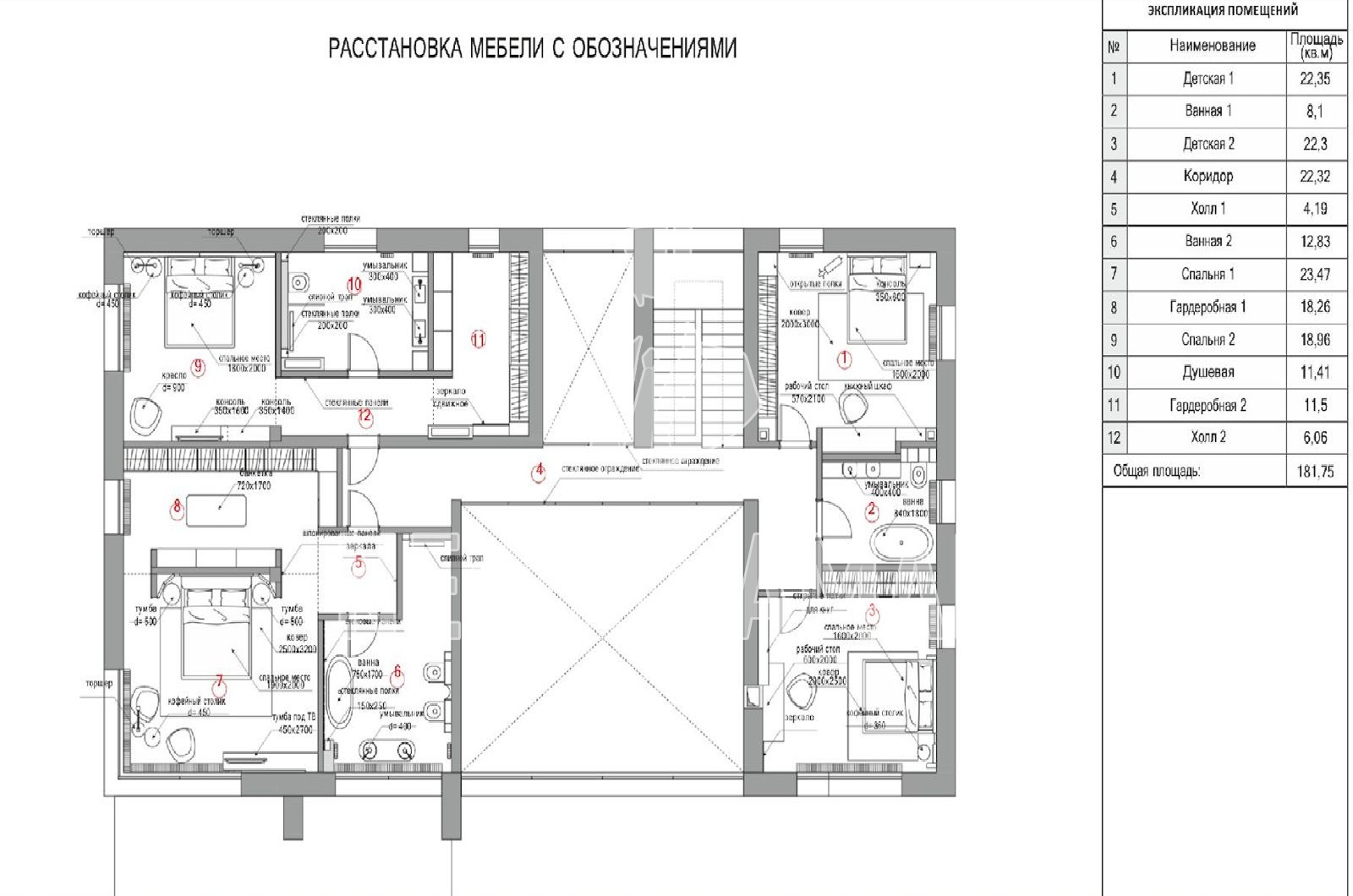 2 этаж - 2 хозяйские спальни с гардеробными и санузлами, 2 детские комнаты с собственными гардеробными и санузлом.
