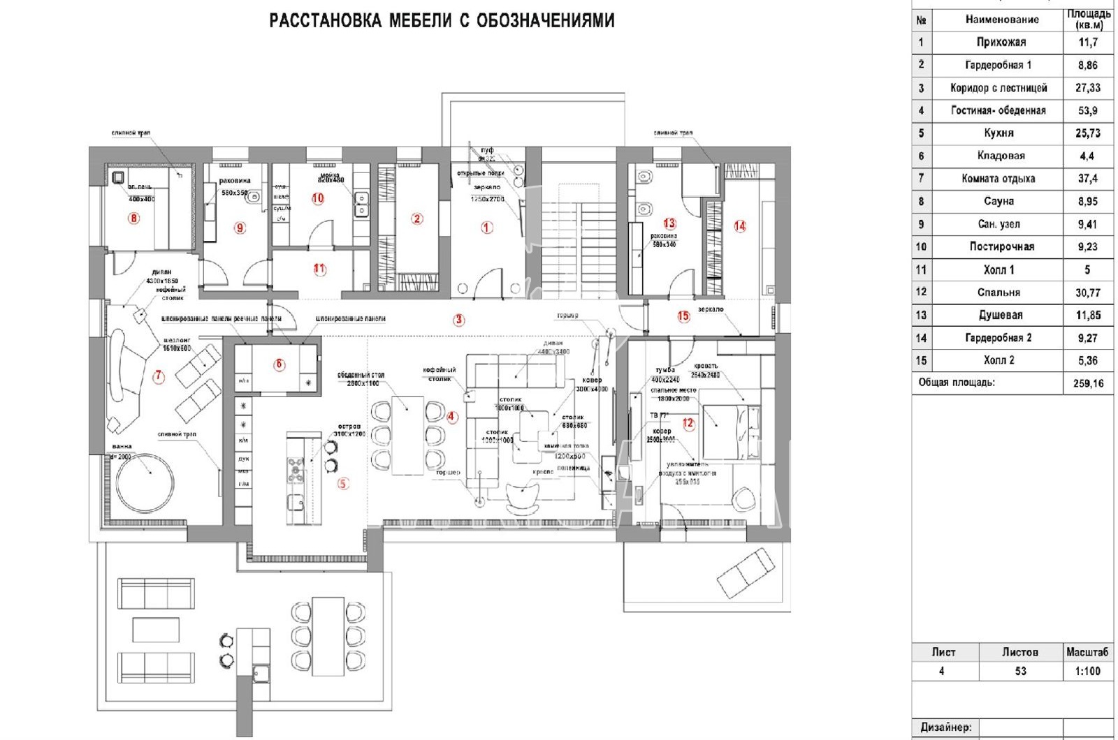 1 этаж - гостиная с камином, столовая, кухня, спальня с гардеробной и санузлом, гостевая зона, СПА-комплекс с сауной и джакузи, выход на террасу,