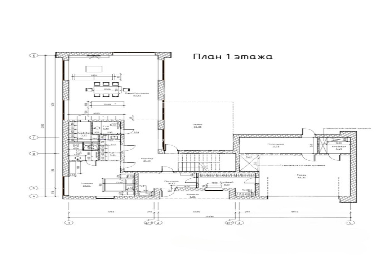 1 этаж - холл, гардероб, кухня с кладовой-столовая-гостиная с выходом на патио, с/у, спальня с с/у, постирочная, котельная, гараж на 2 м/м с кладовой,