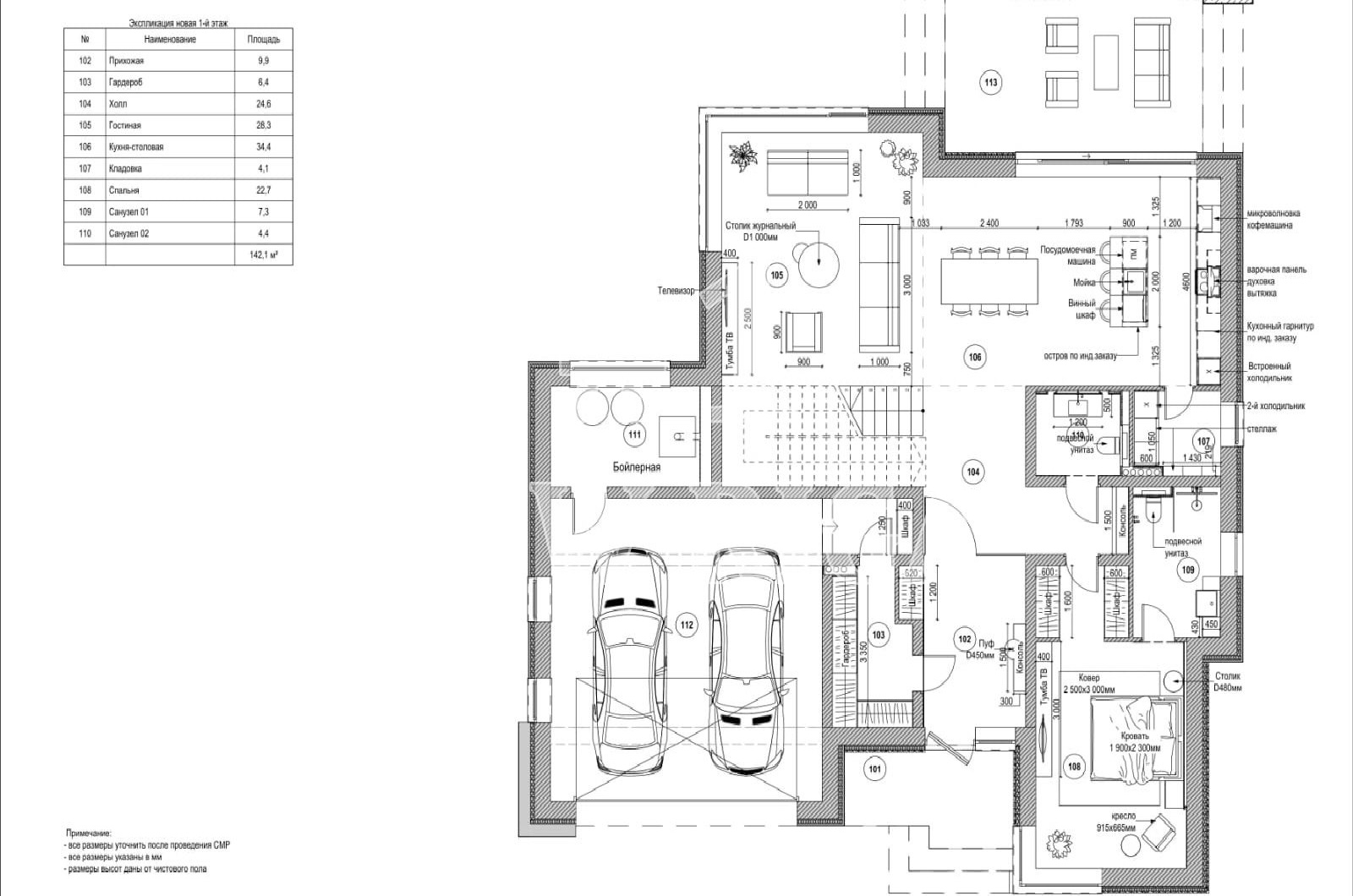 1 этаж - холл, гардеробная, гостиная, кухня-столовая, спальня, 2 с/у, кладовая, гараж,