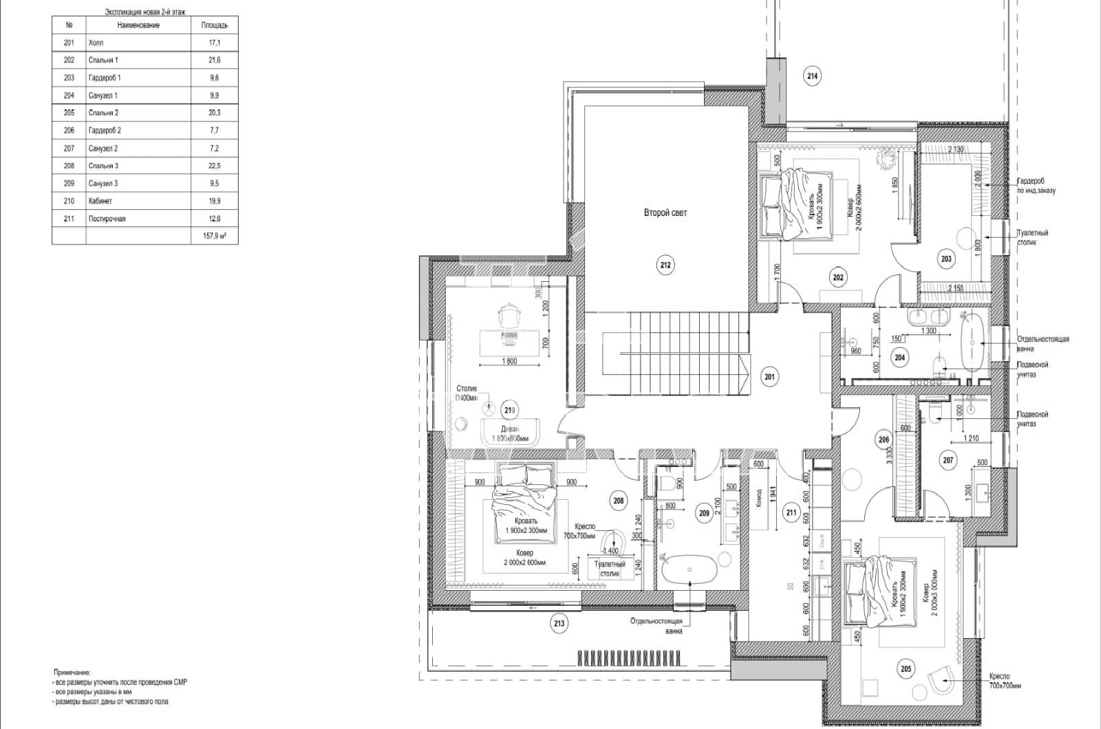 2 этаж - 2 спальни с гардеробными и с/у, спальня c с/у, кабинет, постирочная.