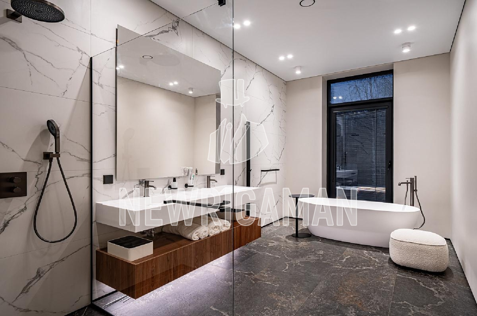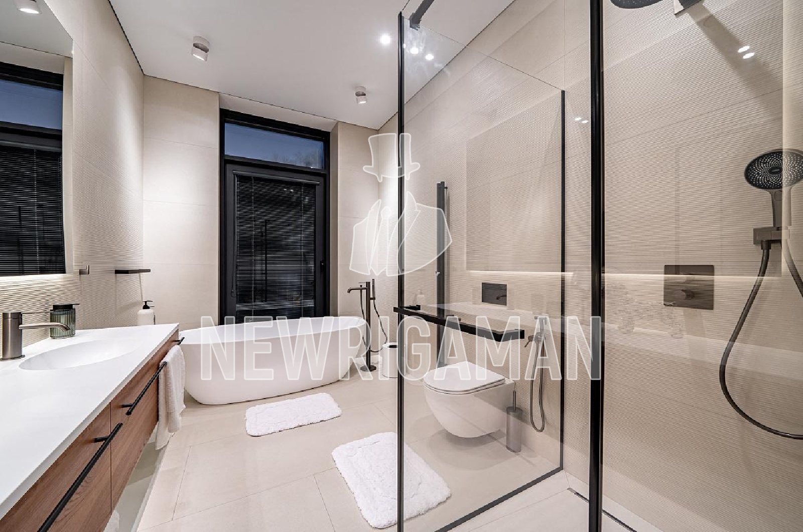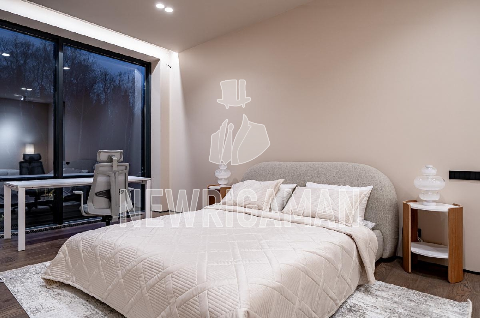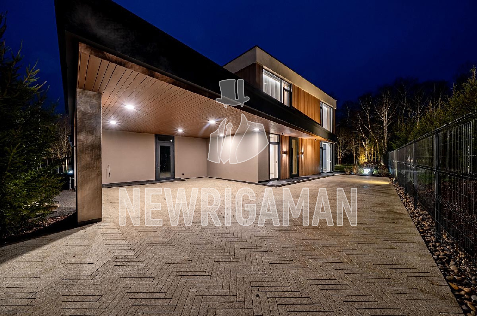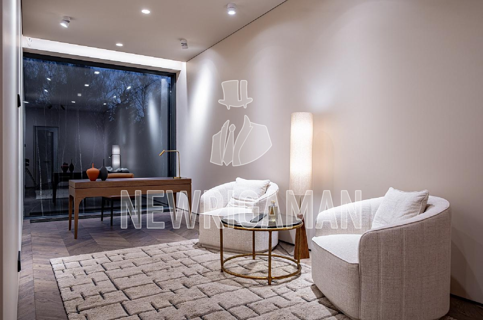 Hi-Tech и Contemporary. Дом отличается лаконичными формами, чёткой геометрией и большими панорамными окнами. В отделке фасада использованы современные и долговечные материалы. Панорамное остекление системы Alutech открывает вид на окружающий лес и наполняет дом светом. В интерьере реализован стиль contemporary - это сдержанная элегантность, функциональность и использование натуральных материалов. В отделке интерьера использованы только качественные и износостойкие материалы. Полы на первом этаже выполнены из керамогранита, стены окрашены краской датского бренда Flugger. Дом оборудован современными инженерными системами. Отопление реализовано через внутрипольные конвекторы Eva и газовый котёл Вахі Slim европейского производства. В доме и на участке установлено современное освещение, которое можно регулировать в зависимости от времени суток и настроения. Участок площадью 30 соток полностью благоустроен и идеально вписан в природное окружение. Просторная территория с тремя террасами и двумя балконами подходит как для отдыха, так и для приёма гостей. Из окон открываются виды на лес, а окружающая среда наполняет пространство тишиной и свежестью.