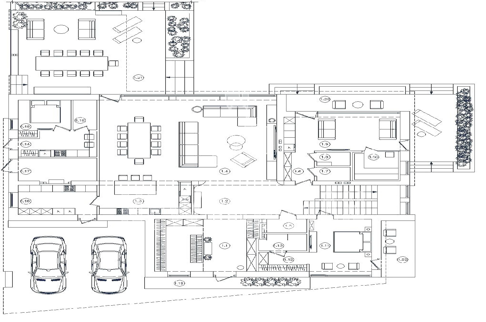 1 этаж - тамбур, кухня, столовая-гостиная, гостевой с/у, гостевая спальня, гардеробная, с/у, котельная, рабочая кухня, кухня для персонала, спальня, с/у, спа-зона: раздевалка, с/у, закрытая раздевалка с душевой, комната отдыха, сауна,
