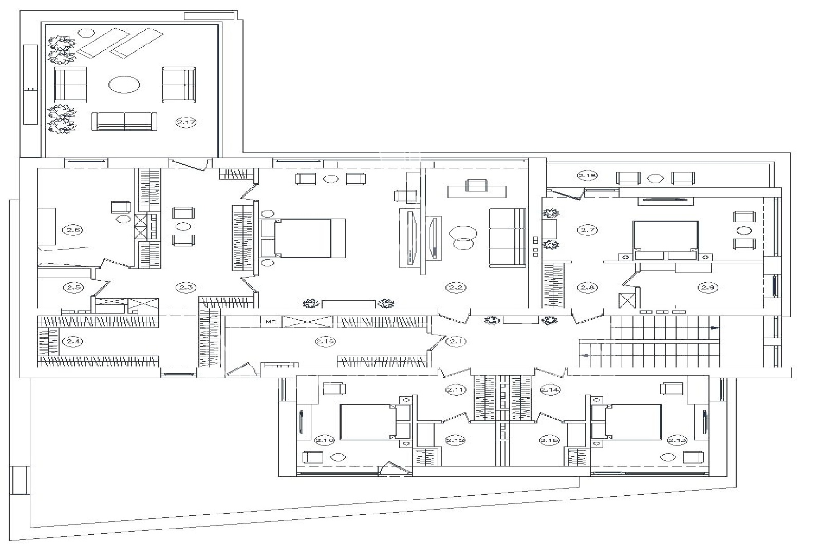 2 этаж - хозяйская спальня, женская и мужская гардеробные, с/у, ванная, постирочная, 3 детские спальни с гардеробными и с/у.