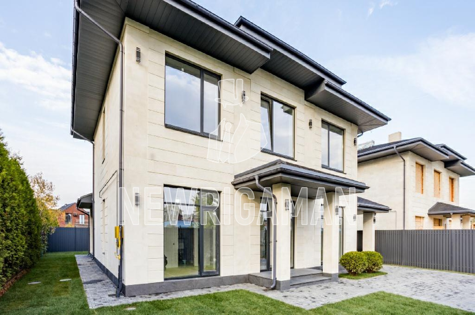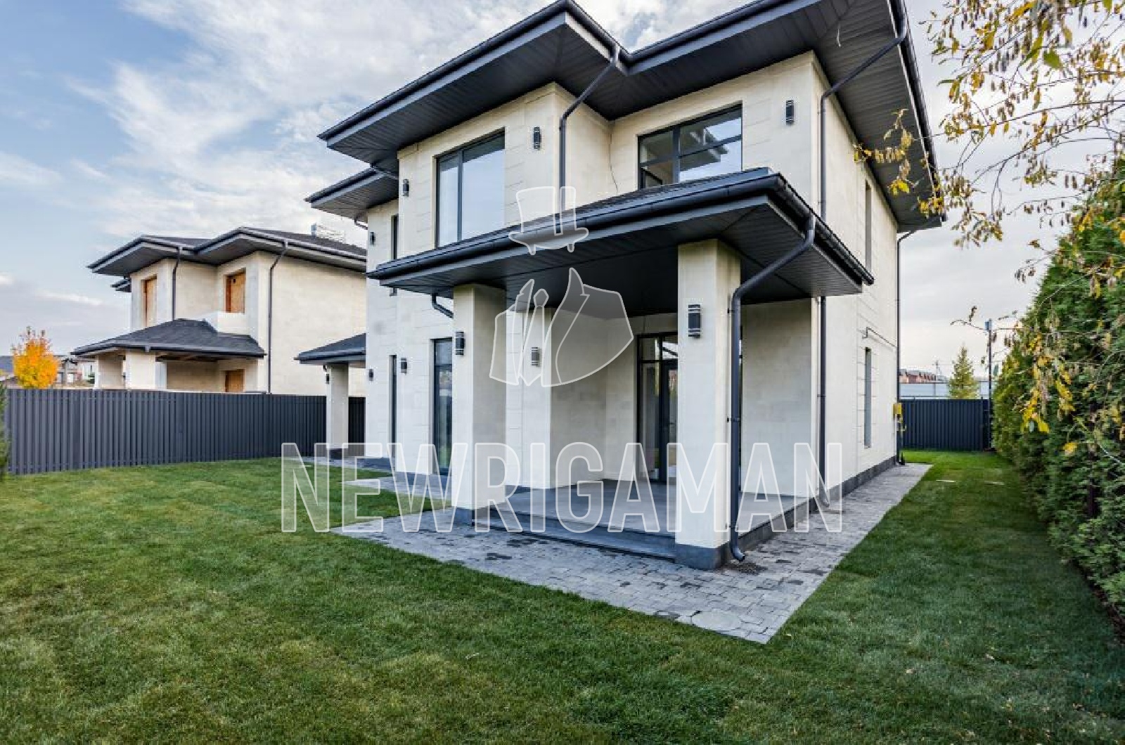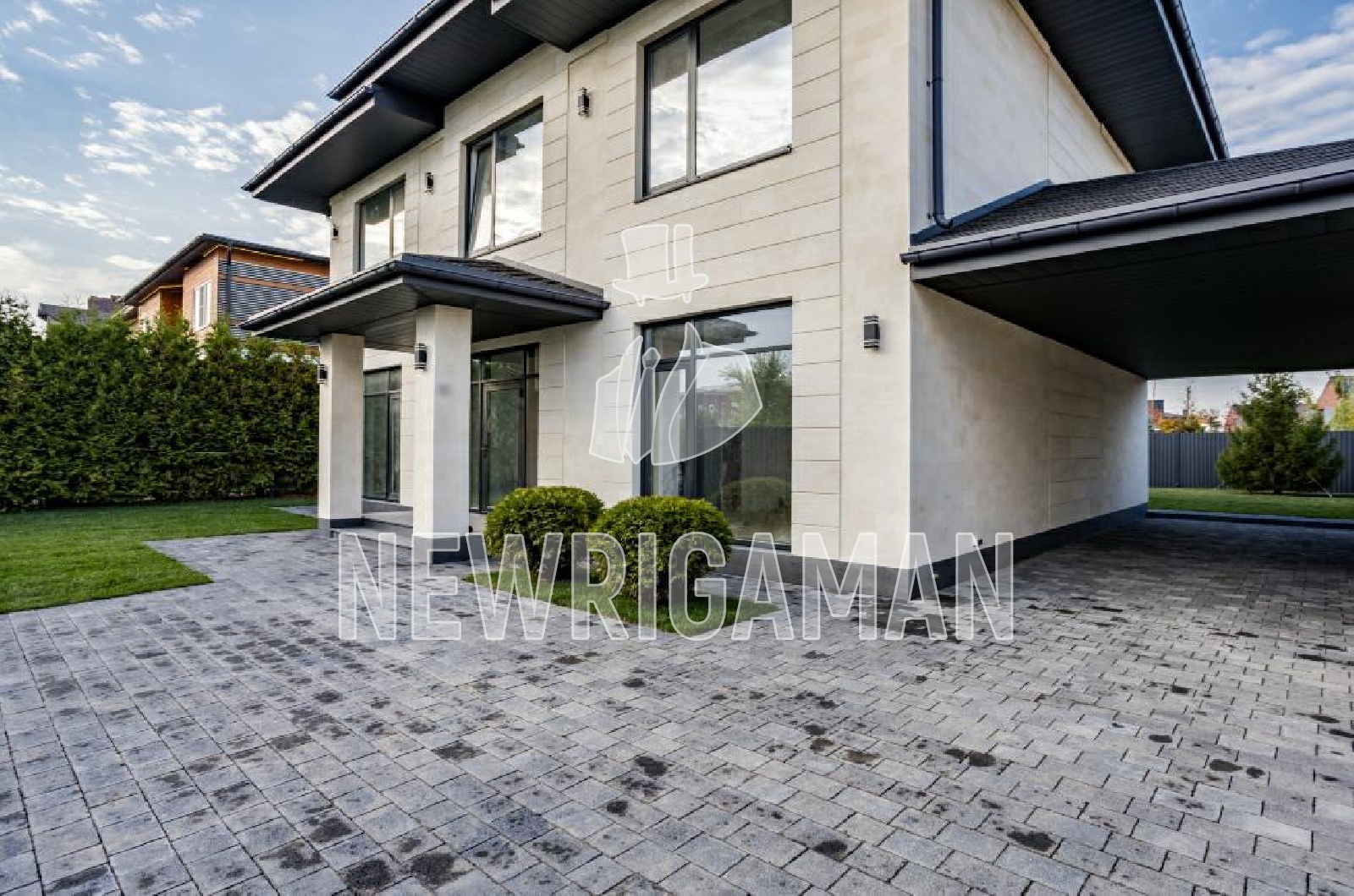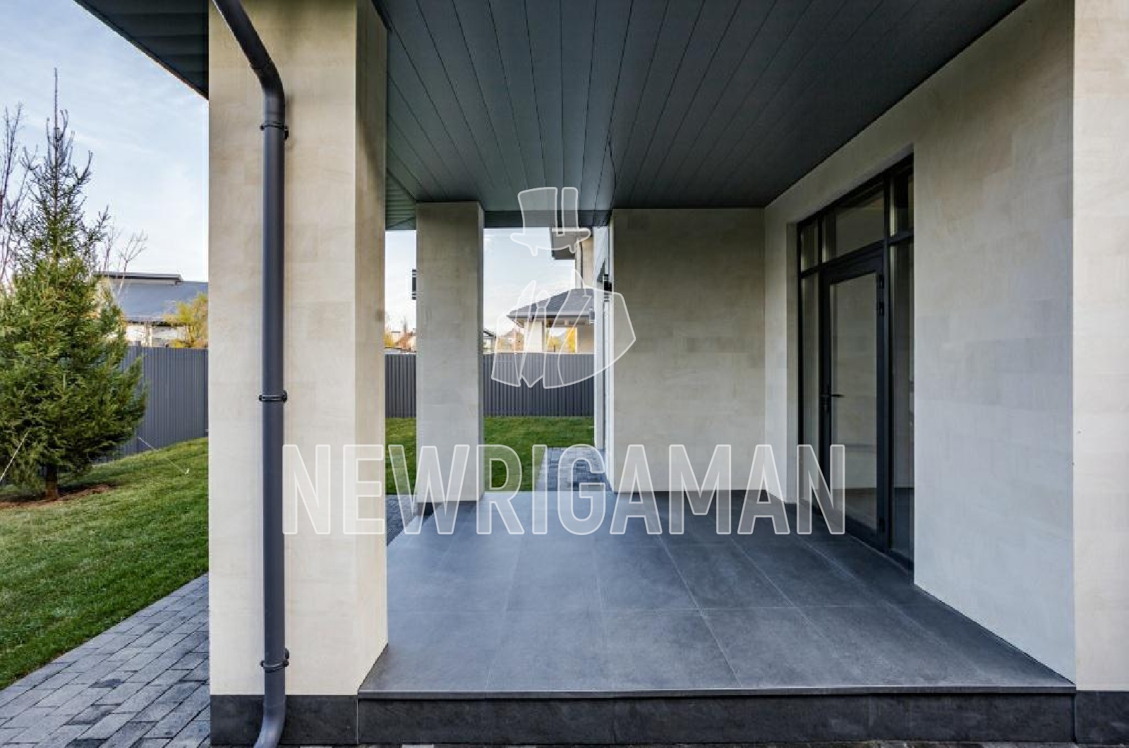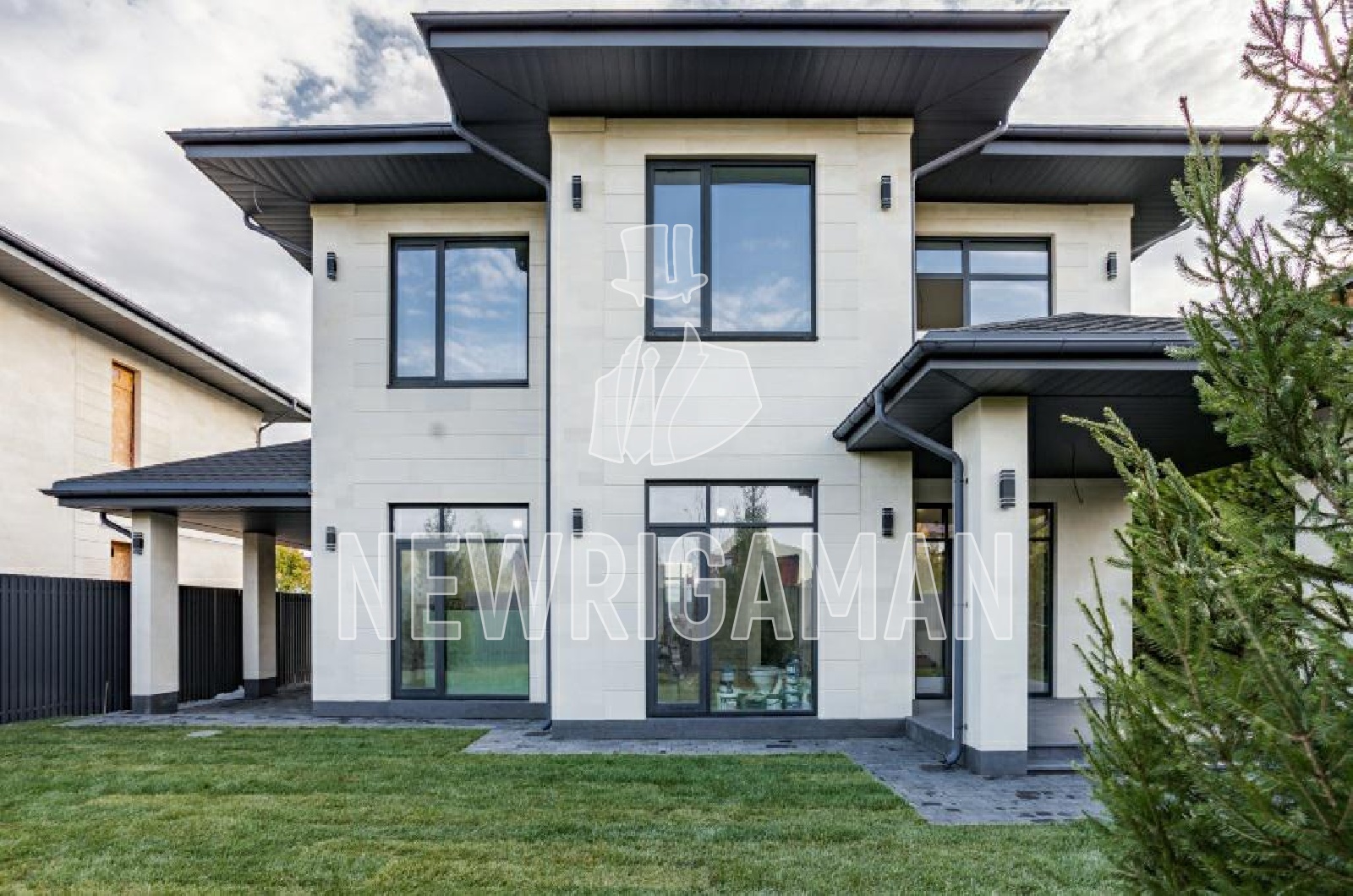 Продажа загородного дома площадью 250 кв.м. Новорижское шоссе 23 км от МКАД. Коттеджный посёлок Новорижский. Архитектура дома выполнена в современном стиле, где основное внимание уделено выразительности форм и свободе планировочных решений. Фасад облицован натуральным дагестанским камнем, установлены алюминиевые окна, а территория вымощена премиальной брусчаткой Steingot. Забор оснащён автоматическими воротами с электроприводом. Дом находится в состоянии white box: выполнена укладка керамогранита на полах, стены подготовлены под покраску, потолки полностью завершены. Все санузлы оборудованы качественной сантехникой. В стоимость входят шторы, люстры и диван. Кухонная зона подготовлена в соответствии с дизайн-проектом. Участок площадью 6,2 сотки - открытого типа, что создаёт простор для индивидуального ландшафтного оформления. На территории высажены крупномерные растения.