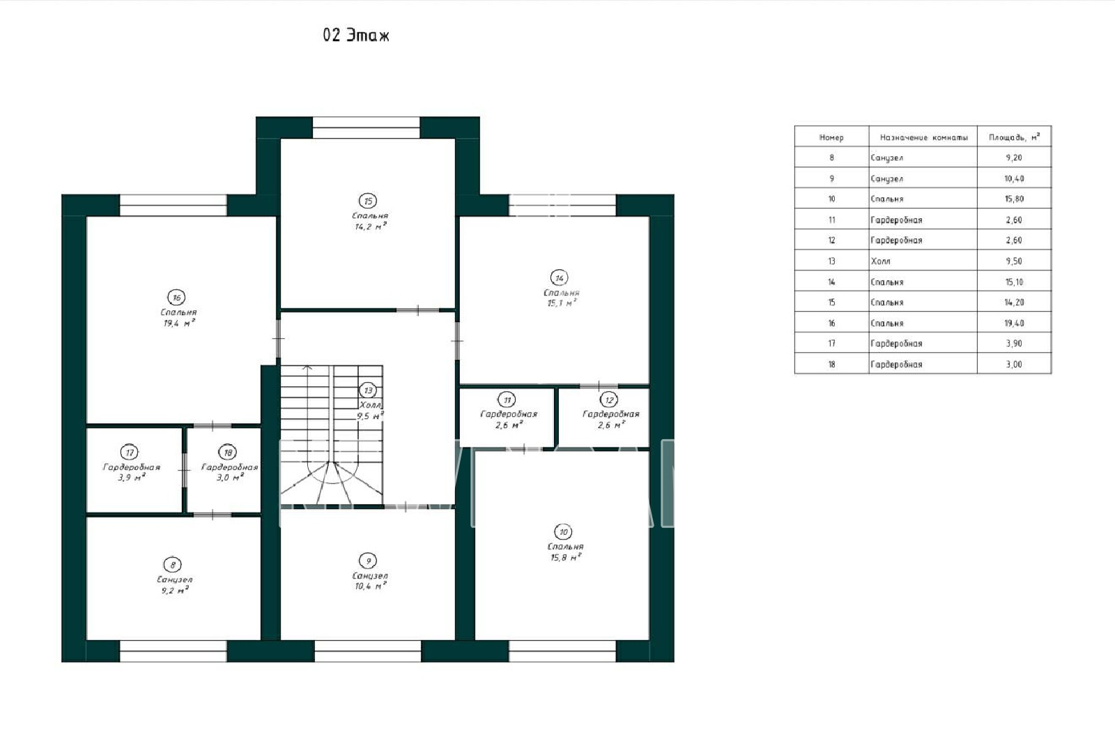 2 этаж - хозяйская спальня со своим с/у и гардеробной, 3 детские спальни с гардеробными, с/у.