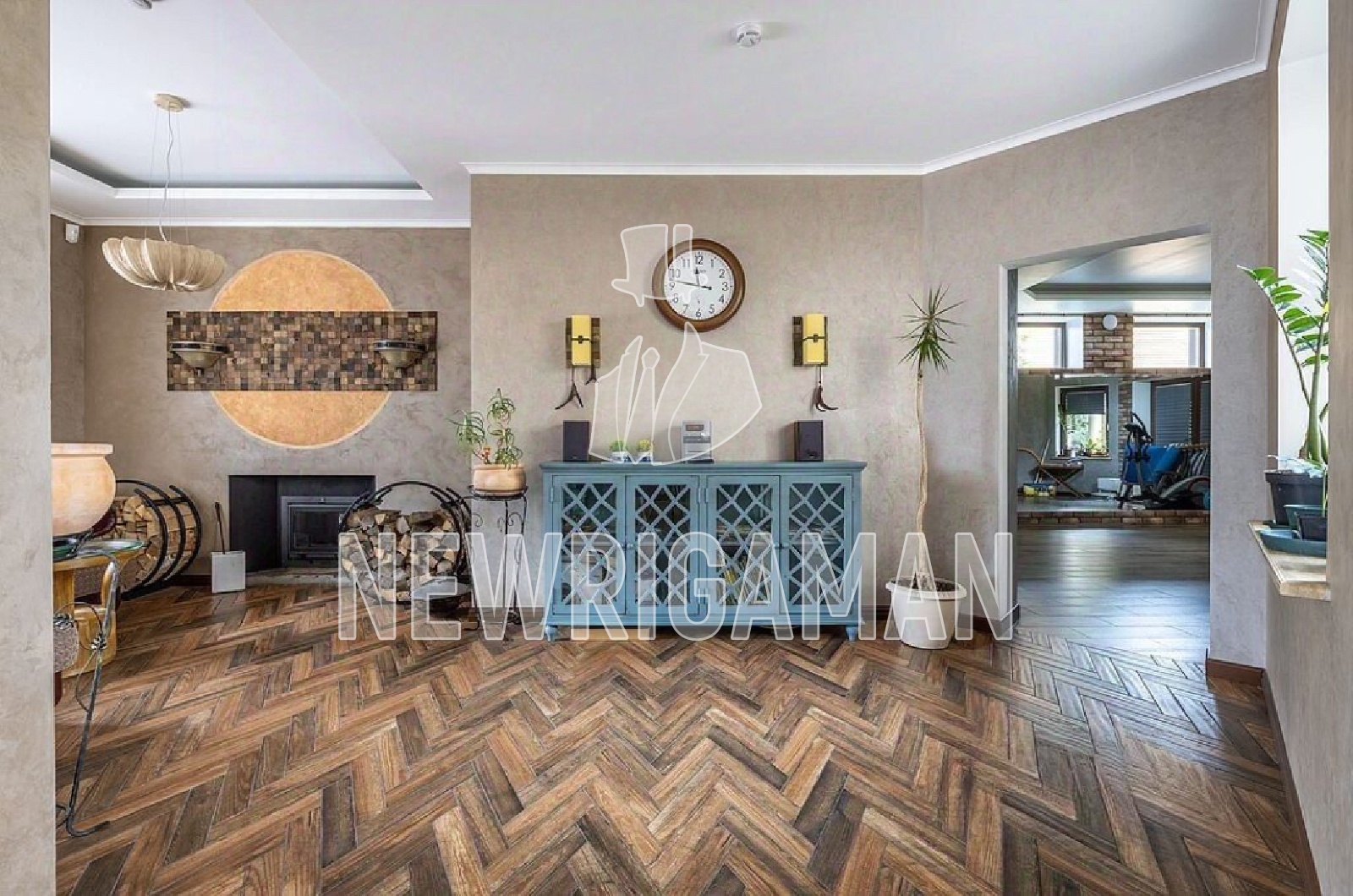 1 этаж - парадный холл, пространство с камином для приема гостей, гостевой с/у, кухня с островом, столовая и гостиная с камином, второй вход из гаража,