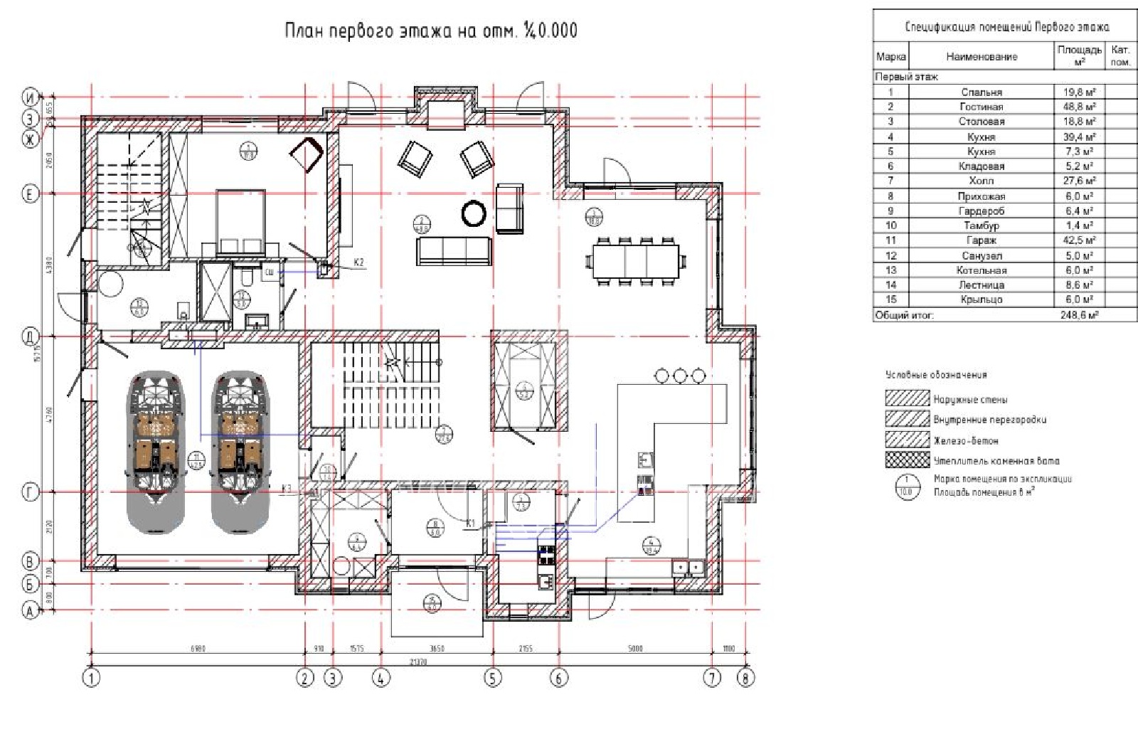 1 этаж - спальня, гостиная, кухня, столовая, кухня, кладовая, гардероб, тамбур, с/у, гараж, котельная,