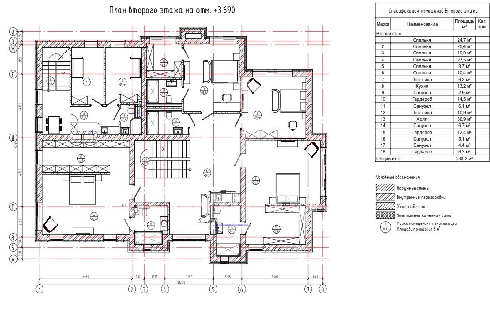 2 этаж - холл, 6 спален, кухня, 5 с/у, 3 гардеробные.