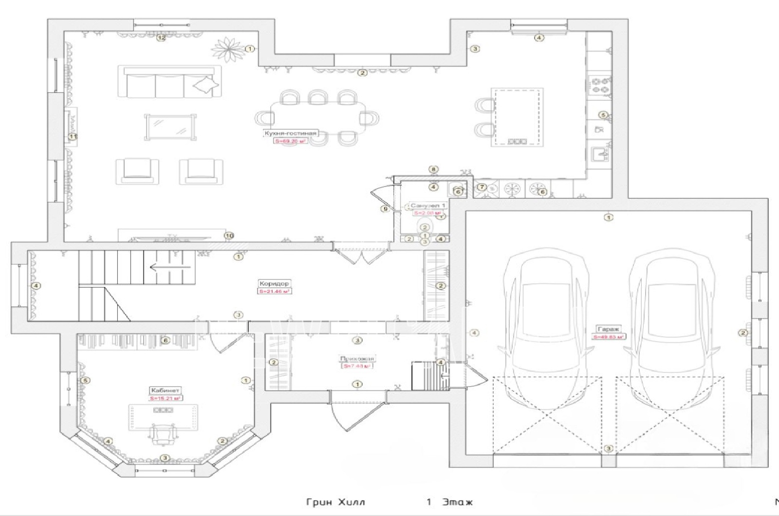 1 этаж - кухня-гостиная, столовая, с/у, кабинет, прихожая, гараж на 2 м/м,