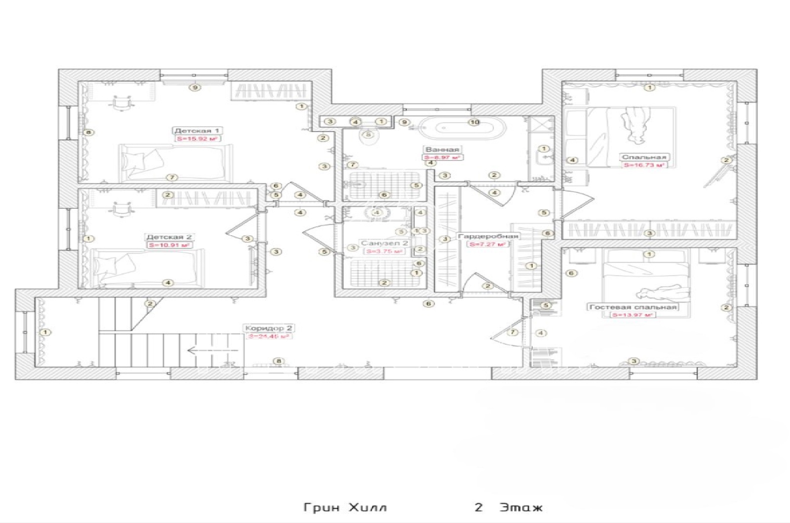 2 этаж - 2 детские спальни, спальня с гардеробной и ванной комнатой, гостевая спальня, с/у,