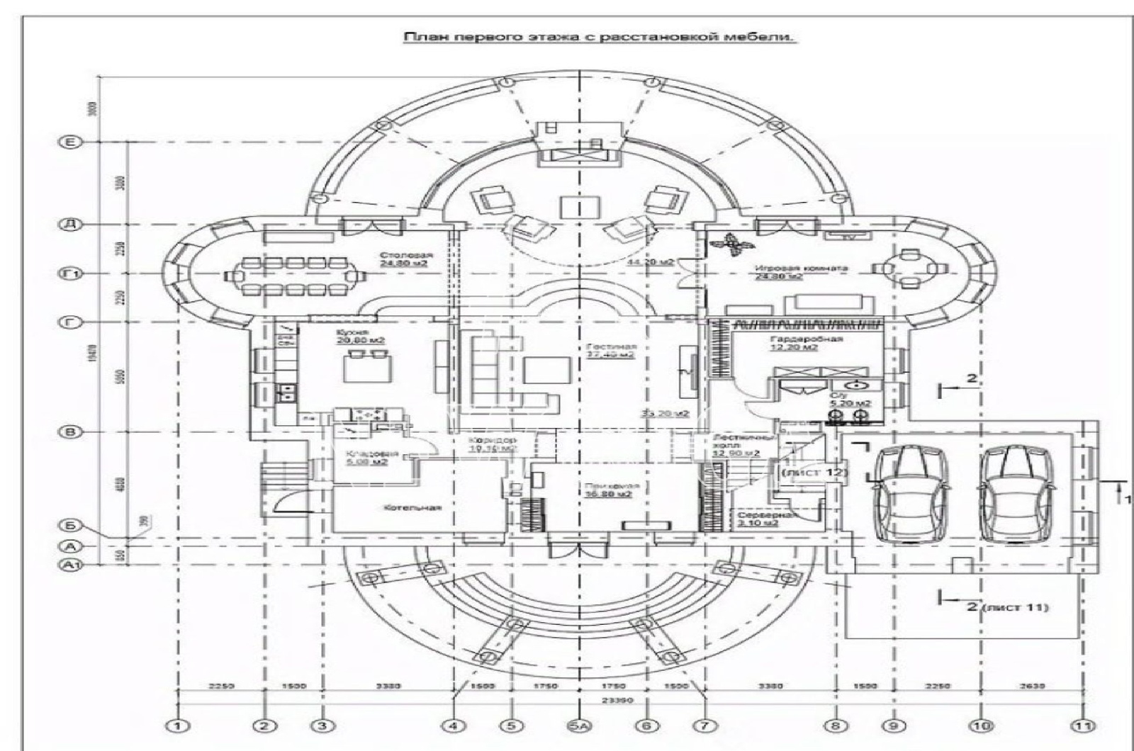 1 этаж - холл c гардеробом, кухня, столовая с выходом в летнюю беседку, гостиная с камином и вторым светом, игровая комната, гардероб, с/у, гараж на 2 м/м,кладовая.