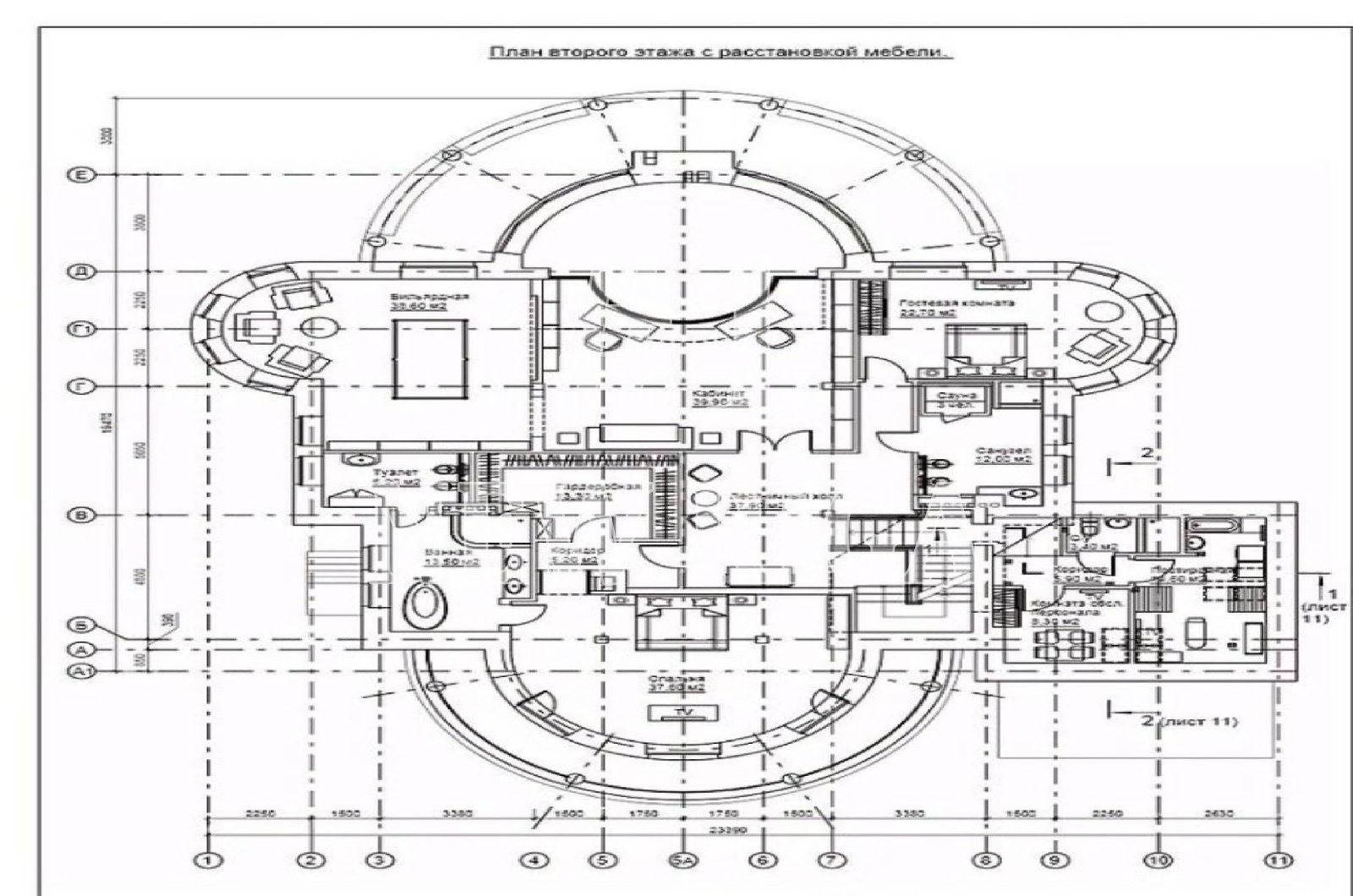 2 этаж - холл, хозяйская спальня с ванной комнатой, гардеробом и балконом, кабинет, бильярдная, спальня, зона СПА с сауной и душевой.