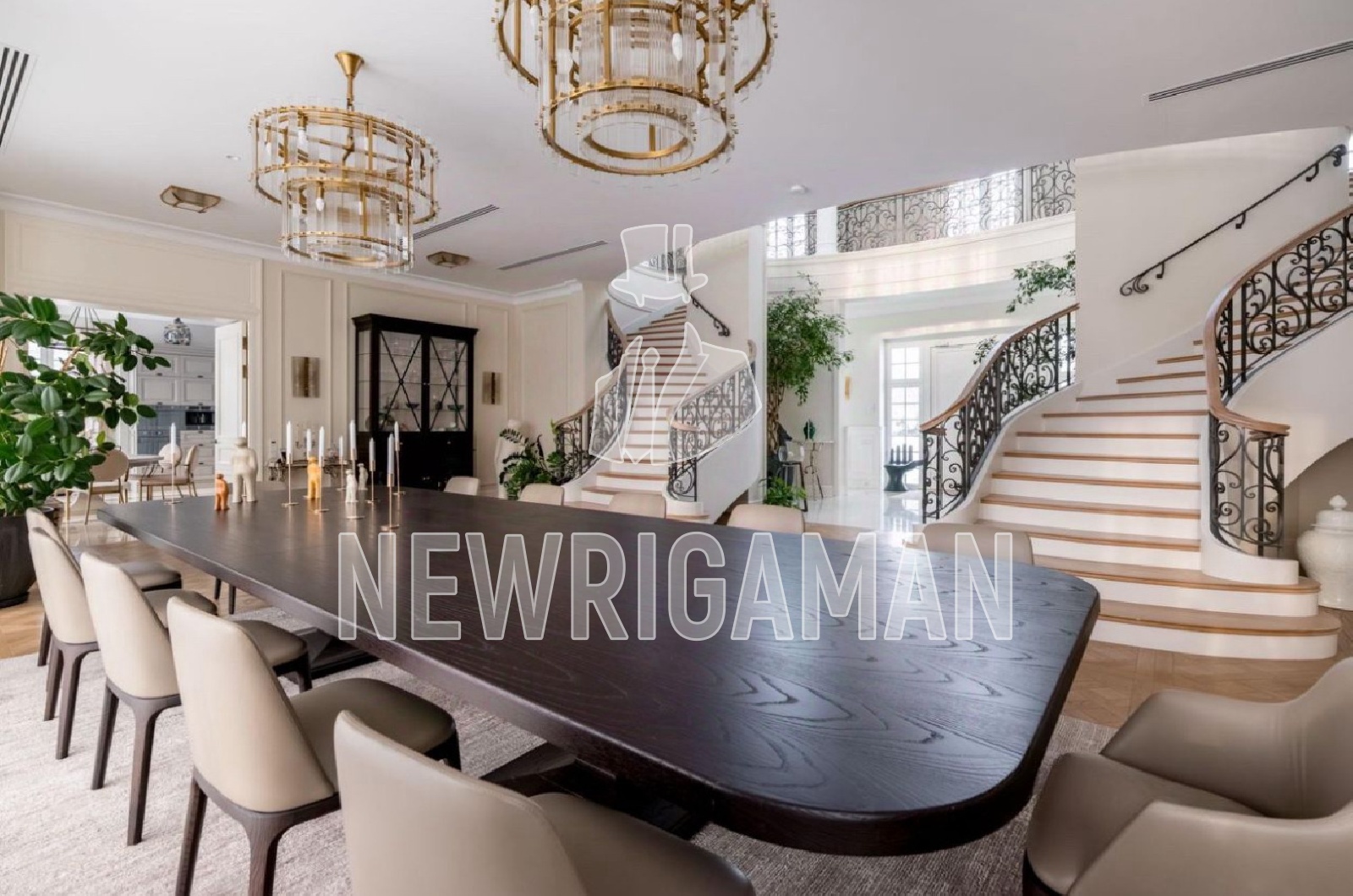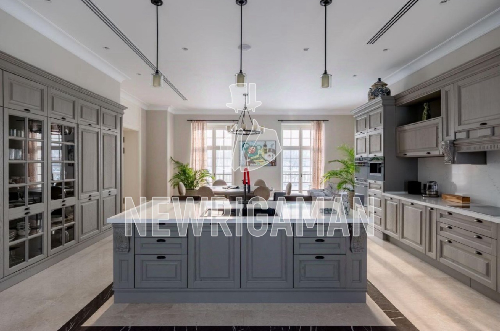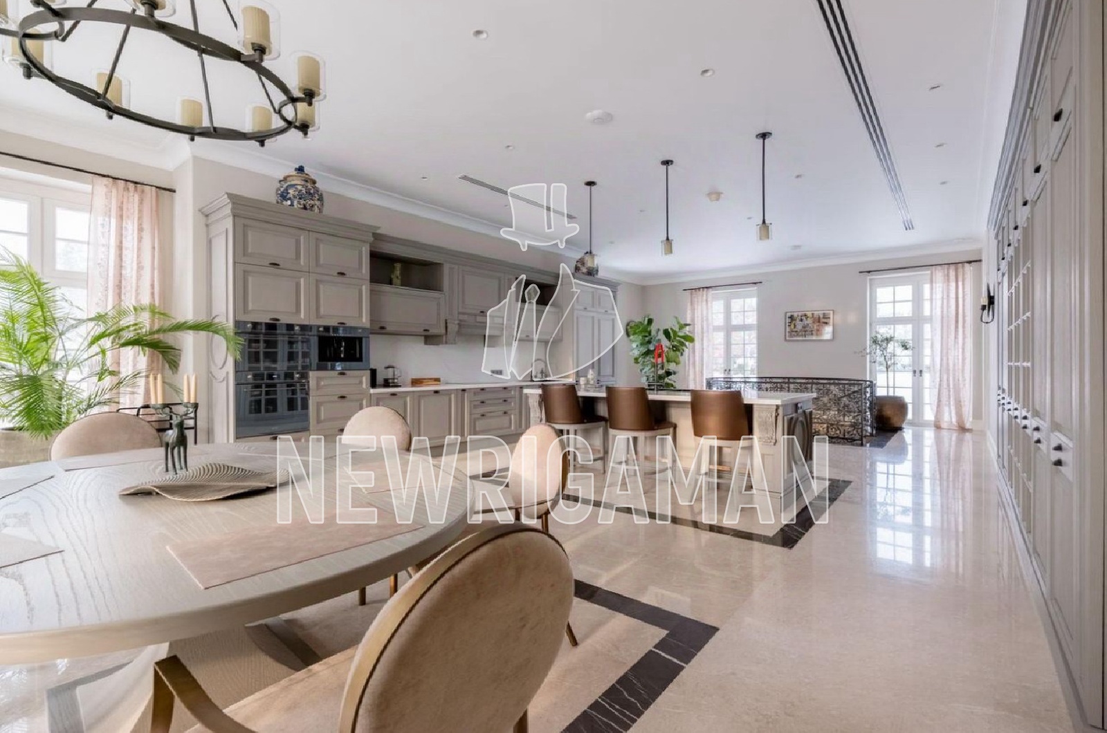 1 этаж - холл, просторная кухня-гостиная, столовая, гостиная с камином и выходом на террасу, ванные, гардеробные и кладовые комнаты,