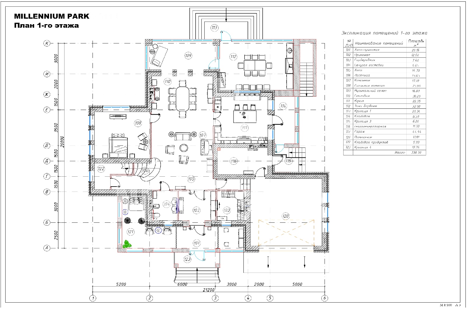 1 этаж - просторный холл, гардеробная, гостиная с камином, кухня c выходом на веранду, столовая, гостевая спальня, гостевой с/у, кладовая, гараж на 2 автомобиля, техническое помещение,