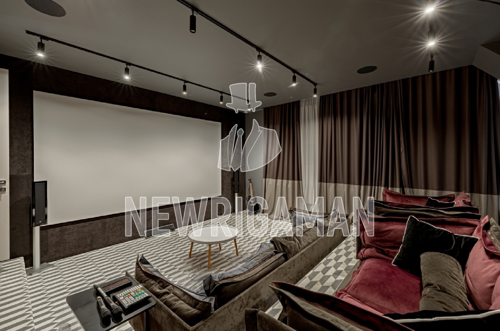 1 этаж - гостиная с биокамином и выходом на террасу, столовая, кухня, спальня с с/у, кинотеатр с лестницей на второй этаж (которая ведет в кабинет), гостевой с/у с зоной постирочной, гардеробная, котельная.