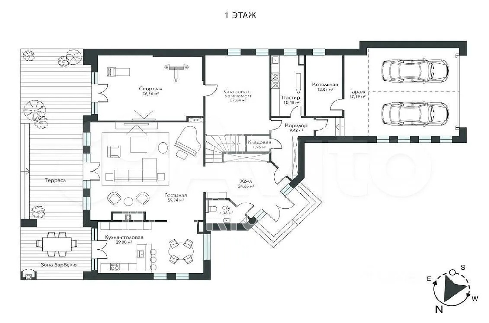 1 этаж - холл, кухня-столовая с выходом на участок, гостиная с камином, с/у, тренажерный зал, хаммам, душевая, постирочная, кладовая, котельная, гараж на 2 м/м