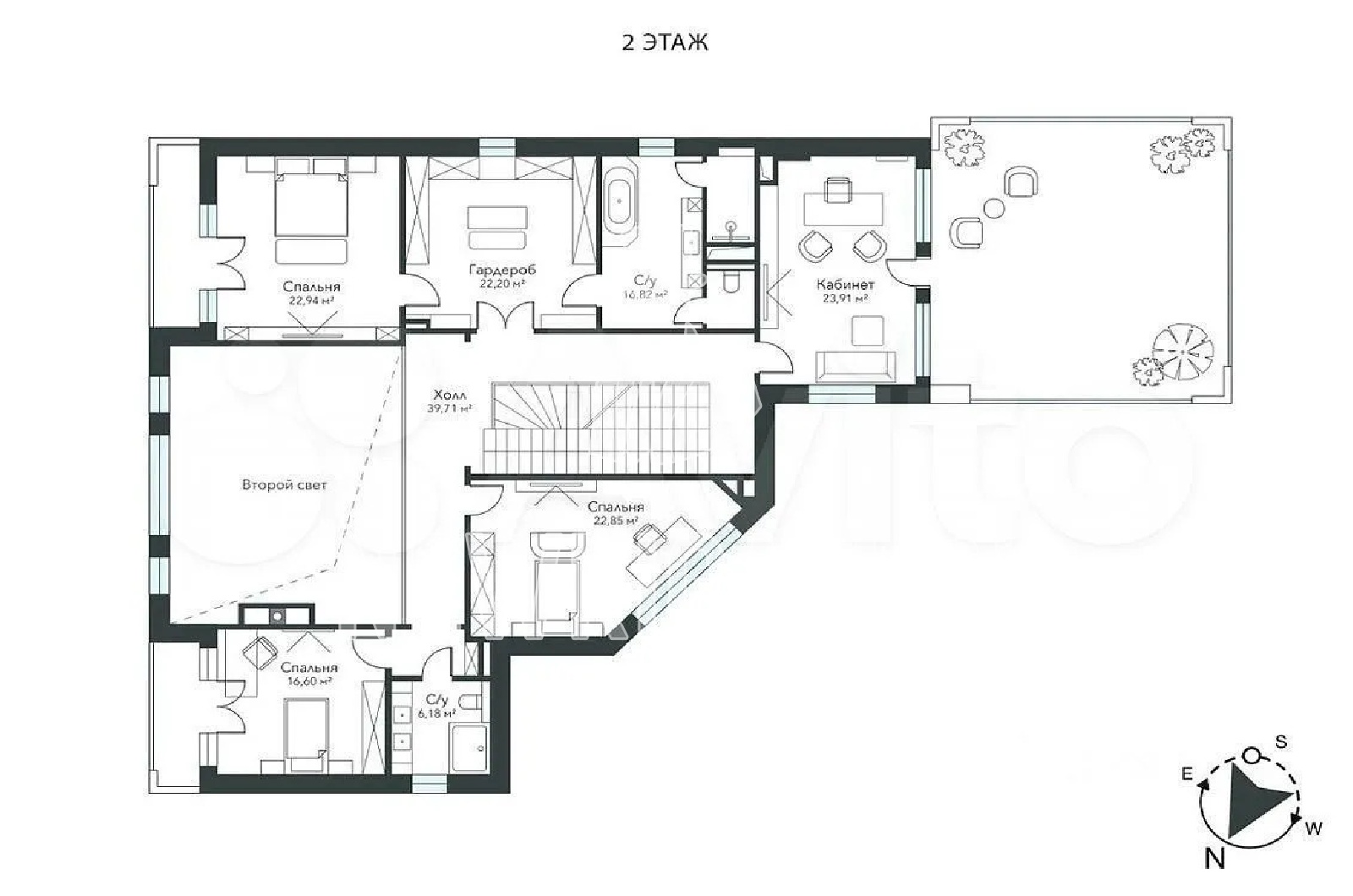 2 этаж - хозяйская спальня с гардеробной и с/у, 2 спальни, кабинет с террасой, с/у