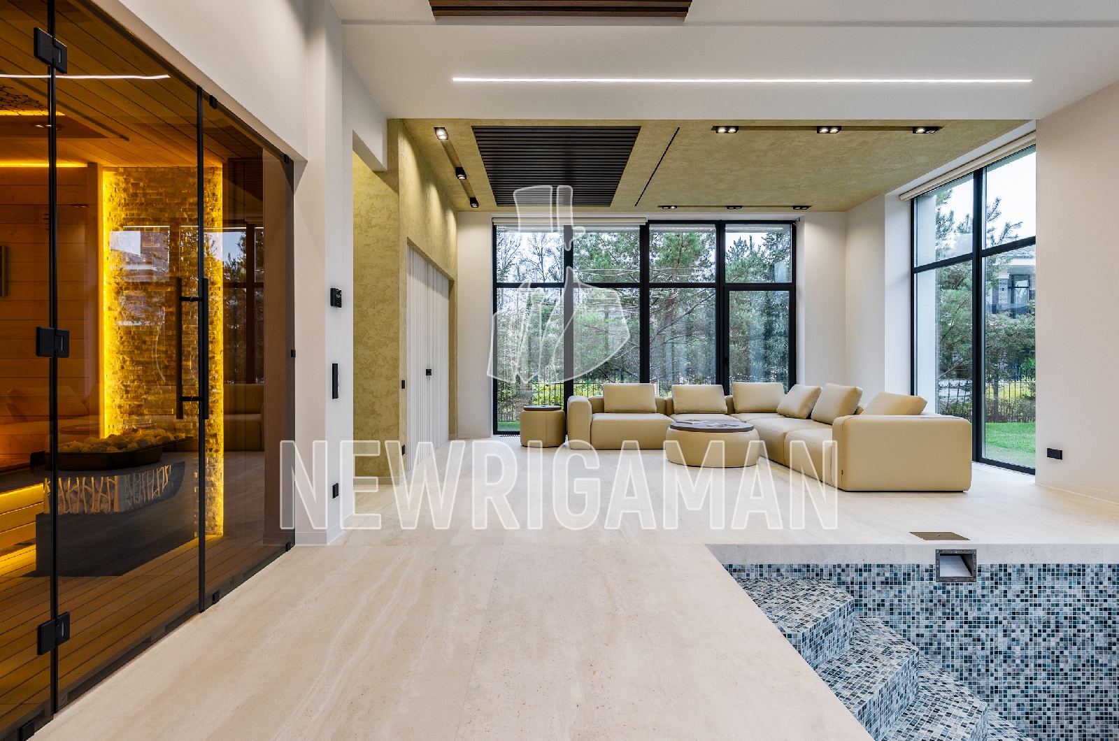 1 этаж - холл, гардеробная, кухня-столовая-гостиная с выходом на веранду, с/у, гостевая спальня с с/у и гардеробной, бассейн, с/у, сауна, котельная, тех. помещение, гараж на 2 м/м,
