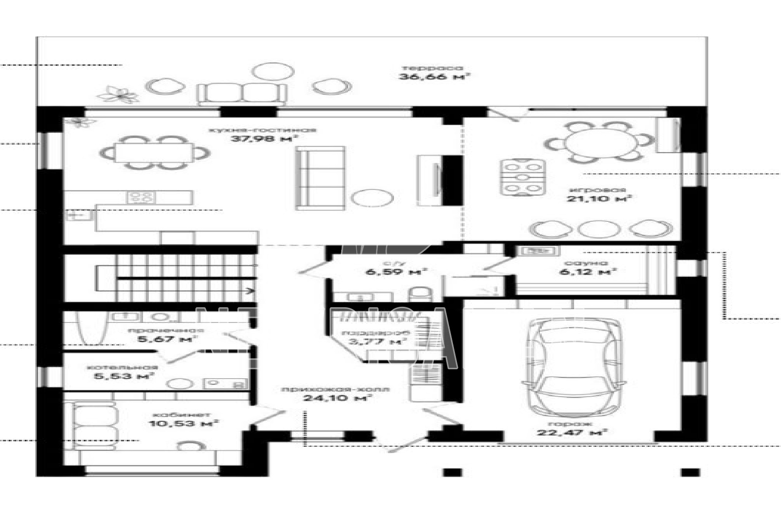 1 этаж - холл, кухня-гостиная-столовая с выходом на крытую веранду, спальня, с/у, сауна, постирочная, котельная, гараж на 1 м/м,