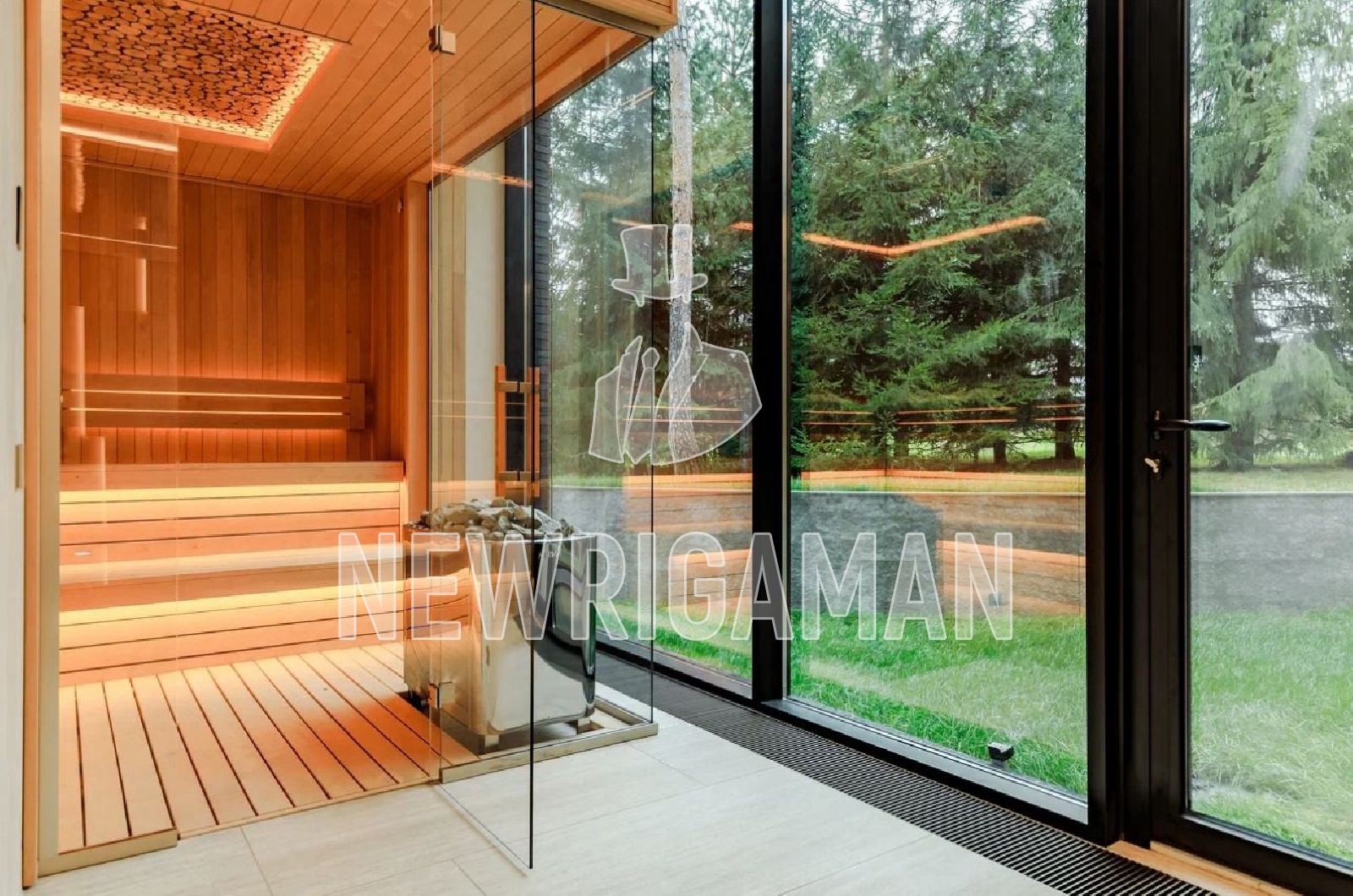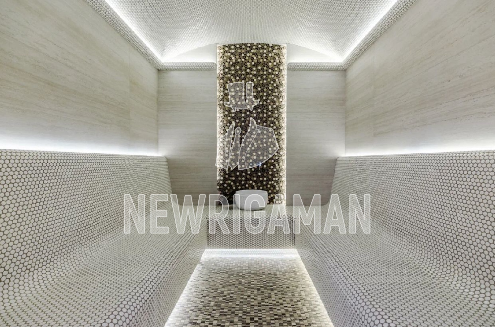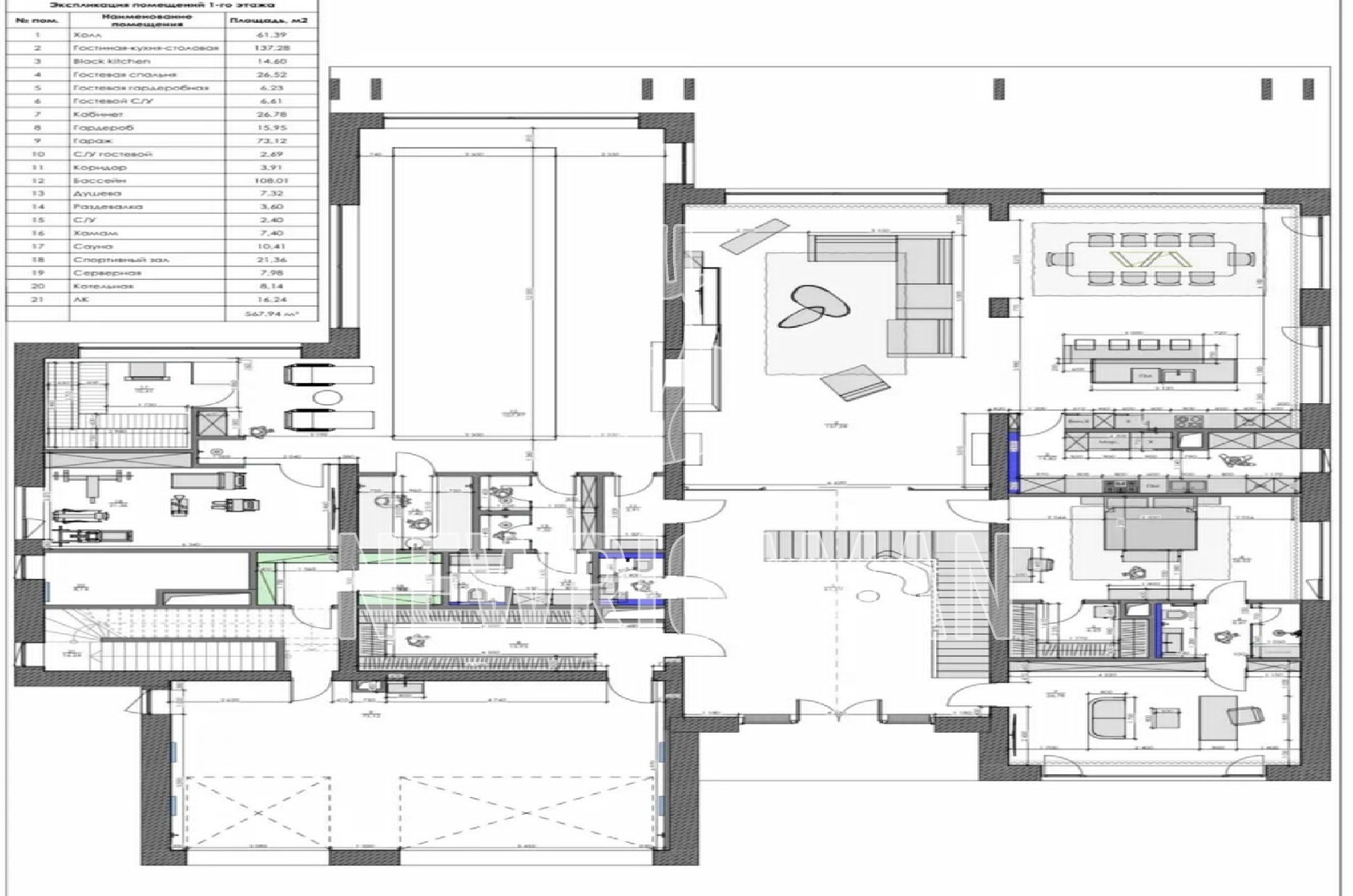 1 этаж - холл, гостиная-кухня-столовая, рабочая кухня, гостевая спальня с гардеробной и с/у, кабинет, гардеробная, гостевой с/у, бассейн, хамам, сауна, душевая, раздевалка, с/у, спортивный зал, серверная, котельная, личный кабинет,