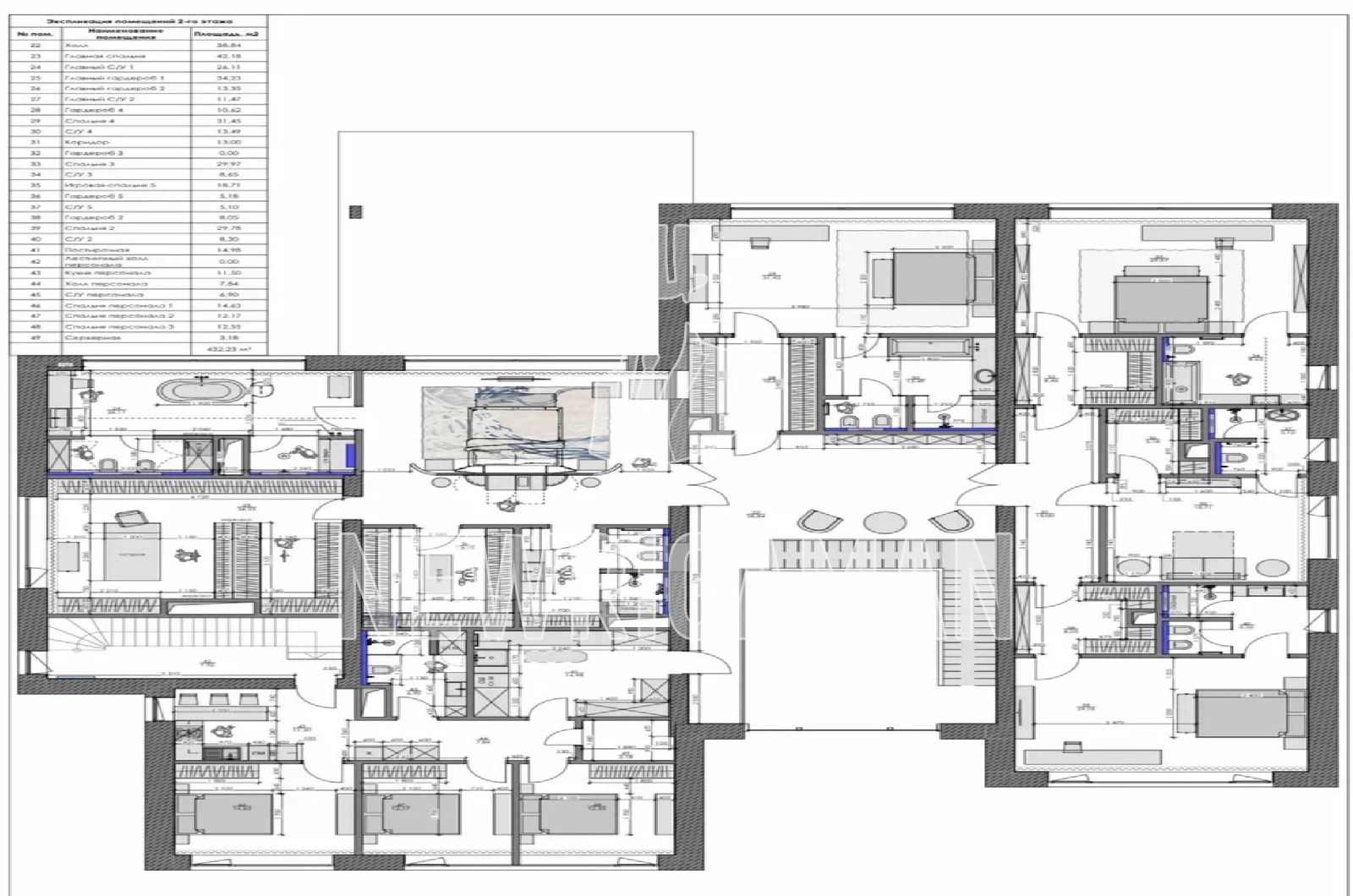 2 этаж - холл, спальня с 2 гардеробными и 2 с/у, 3 спальни с гардеробными и с/у, игровая-спальня с гардеробной и с/у, постирочная, блок персонала: кухня, 3 спальни, с/у, серверная,